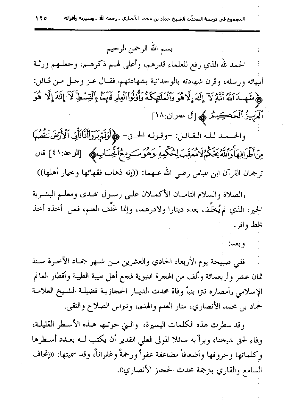 ففي صبيحة يوم الأربعاء الحادي والعشرين من شهر جماد الآخرة سنة ثمان عشر وأربعمائة وألف من الهجرة النبوية فجع أهل طيبة الطيبة وأقطار العالم الإسلامي وأمصاره تترا بنبأ وفاة محدث الديار الحجازية فضيلة الشيخ العلامة حماد بن محمد الأنصاري، منار العلم والهدى، ونبراس الصلاح والتقى.