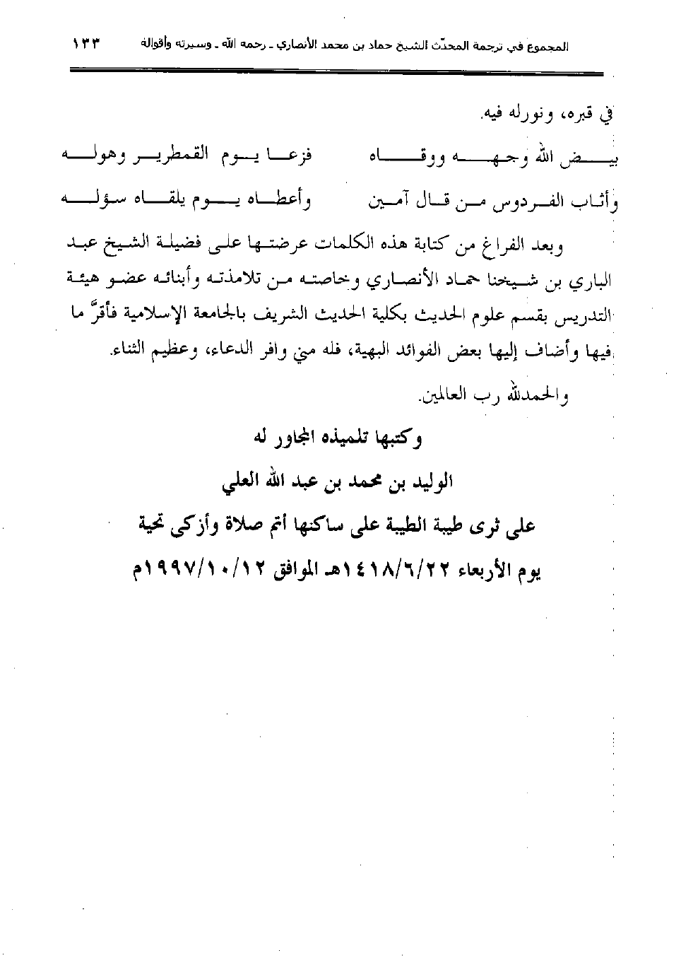 يوم الأربعاء 22/6/1418هـ الموافق 12/10/1997م.