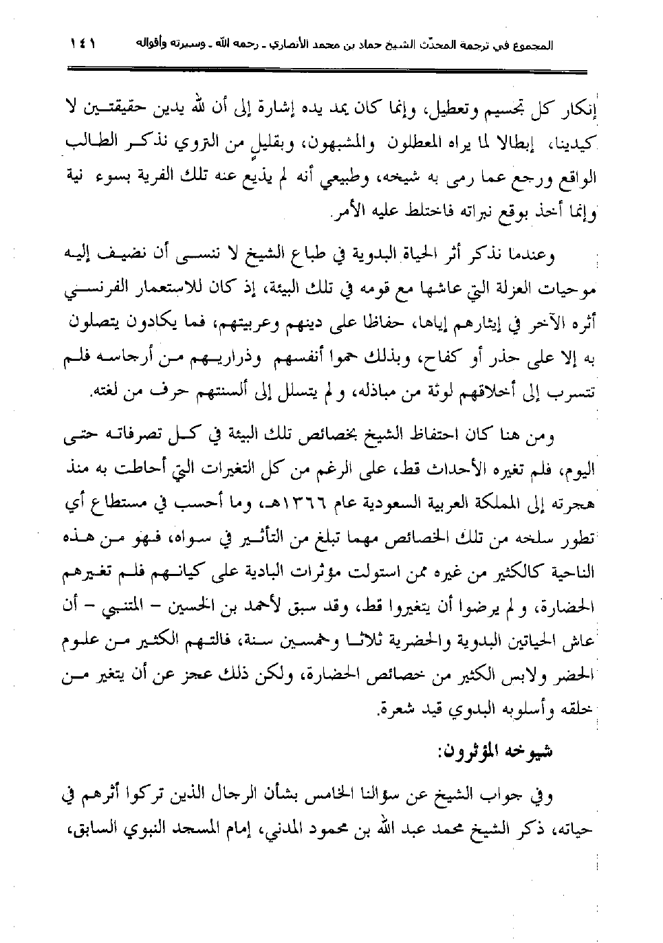 ومن هنا كان احتفاظ الشيخ بخصائص تلك البيئة في كل تصرفاته حتى اليوم، فلم تغيره الأحداث قط، على الرغم من كل التغيرات التي أحاطت به منذ هجرته إلى المملكة العربية السعودية عام 1366هـ، وما أحسب في مستطاع أي تطور سلخه من تلك الخصائص مهما تبلغ من التأثير في سواه؛ فهو من هذه الناحية كالكثير من غيره ممن استولت مؤثرات البادية على كيانهم فلم تغيرهم الحضارة، ولم يرضوا أن يتغيروا قط، وقد سبق لأحمد بن الحسين "المتنبي" أن عاش الحياتين البدوية والحضرية ثلاثا وخمسين سنة، فالتهم الكثير من علوم الحضر ولابس الكثير من خصائص الحضارة، ولكن ذلك عجز عن أن يتغير من خلقه وأسلوبه البدوي قيد شعرة.