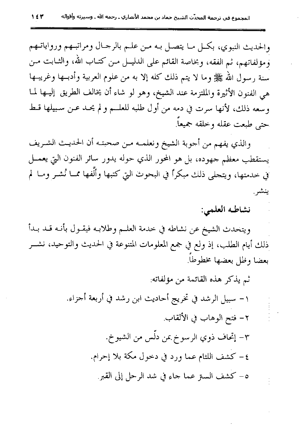 ويتحدث الشيخ عن نشاطه في خدمة العلم وطلابه فيقول بأنه قد بدأ ذلك أيام الطلب، إذ ولع في جمع المعلومات المتنوعة في الحديث والتوحيد، نشر بعضا وظل بعضها مخطوطاً.