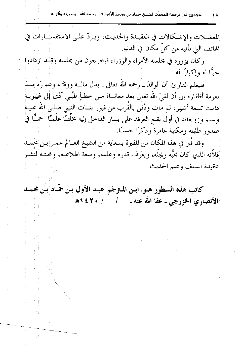 كاتب هذه السطور هو: ابن المترجَم: عبد الأول بن حمّاد بن محمد الأنصاري الخزرجي "عفا الله عنه" / / 1420هـ.
