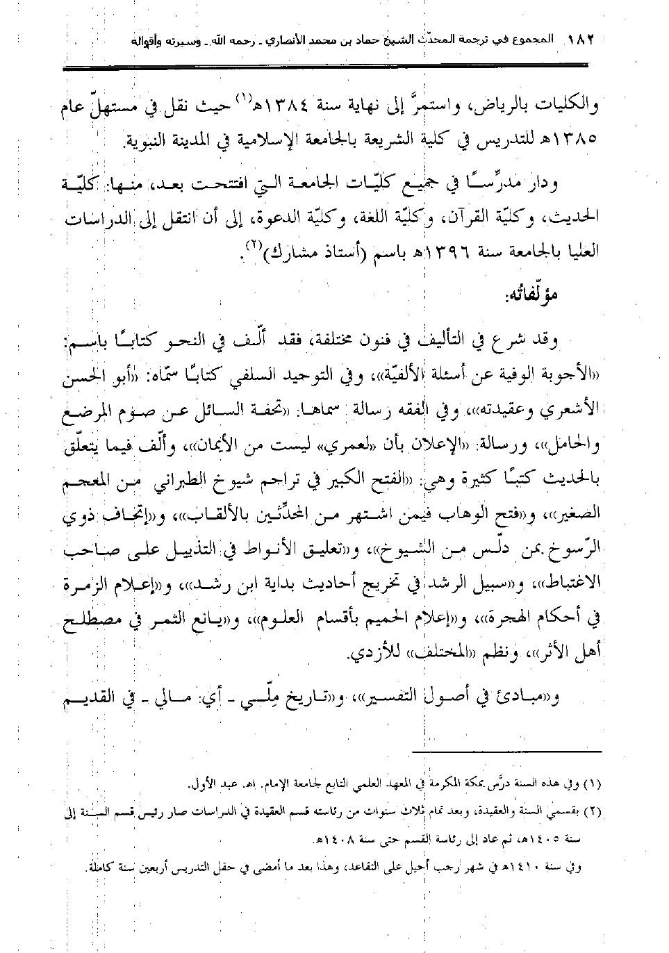 (2) قسمي السنة والعقيدة؛ وبعد تمام ثلاث سنوات من رئاسته قسم العقيدة في الدراسات صار رئيس قسم السنة إلى سنة 1405هـ، ثم عاد إلى رئاسة القسم حتى سنة 1408هـ.