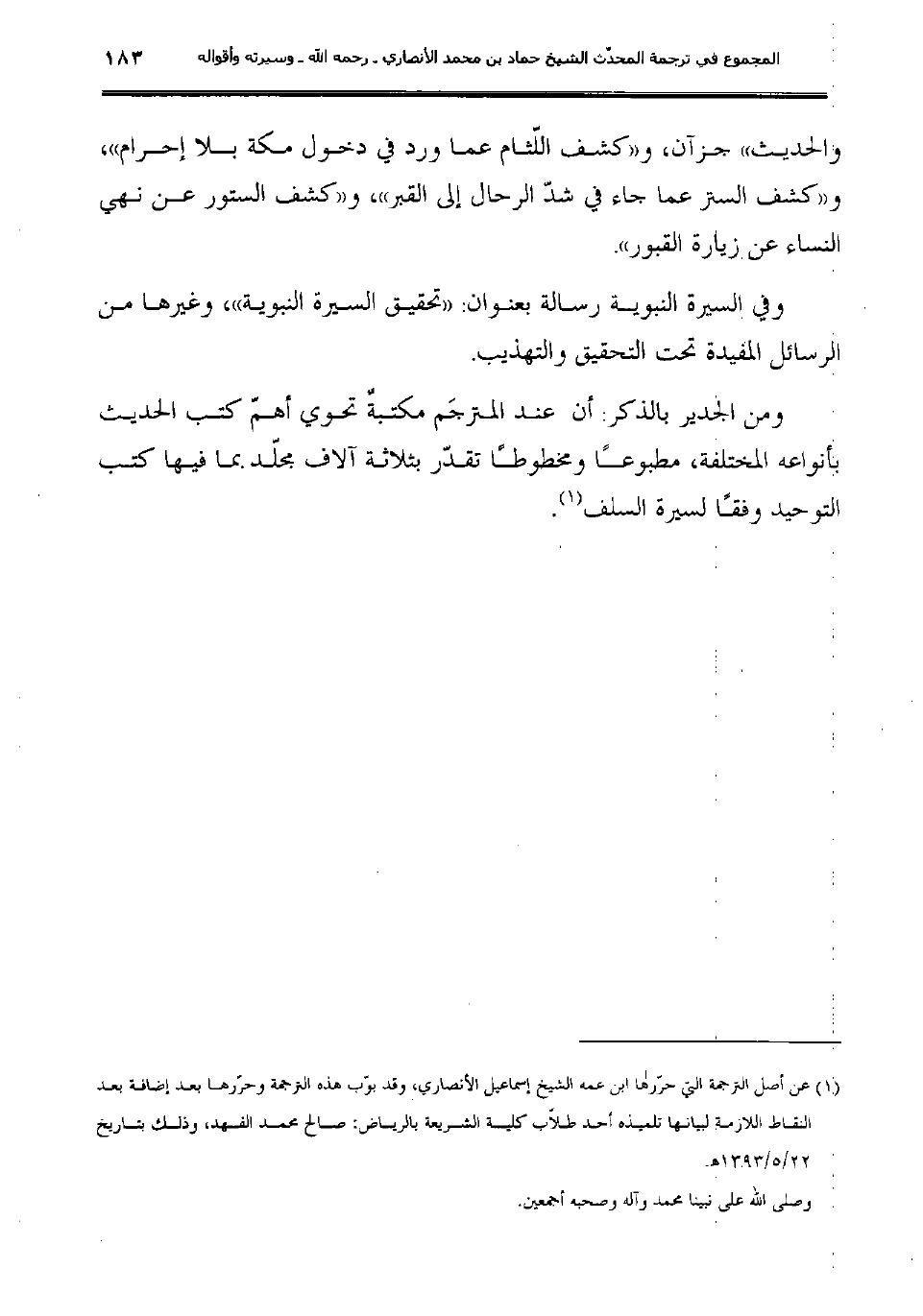 (1) عن أصل الترجمة التي حرّرها ابن عمه الشيخ إسماعيل الأنصاري؛ وقد بوّب هذه الترجمة وحرّرها بعد إضافة بعد النقاط اللازمة لبيانها تلميذه أحد طلاّب كلية الشريعة بالرياض: صالح محمد الفهد، وذلك بتاريخ 22/5/1393هـ.