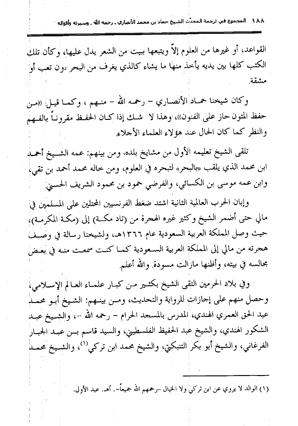 وكان شيخنا حماد الأنصاري "رحمه الله منهم"؛ وكما قيل: (من حفظ المتون حاز على الفنون) ، وهذا لا شك إذا كان الحفظ مقرونا بالفهم والنظر كما كان الحال عند هؤلاء العلماء الأجلاء.