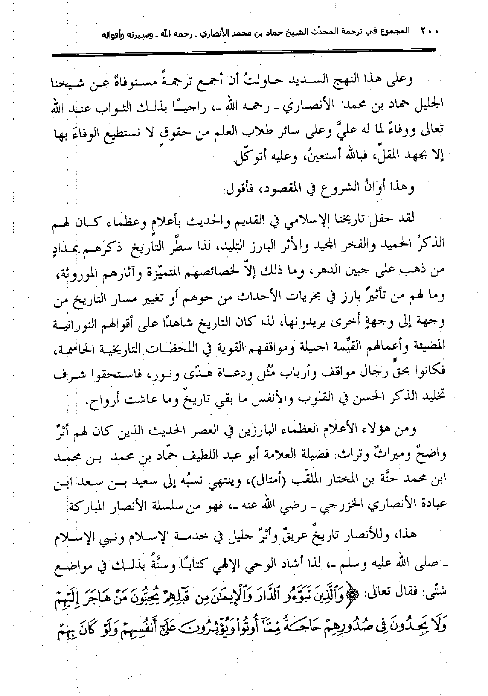 وعلى هذا النهج السديد حاولتُ أن أجمع ترجمةً مستوفاةً عن شيخنا الجليل حماد بن محمد الأنصاري "رحمه الله"، راجيًا بذلك الثواب عند الله تعالى ووفاءً لما له عليَّ وعلى سائر طلاب العلم من حقوقٍ لا نستطيع الوفاءَ بها إلا بجهد المقلِّ؛ فبالله أستعينُ، وعليه أتوكّل.