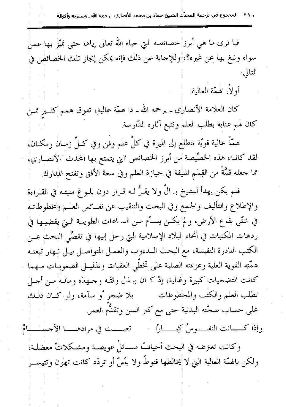 كان العلامة الأنصاري "يرحمه الله" ذا همّة عالية، تفوق همم كثيرٍ ممن كان لهم عناية بطلب العلم وتتبع آثاره الدّارسة.