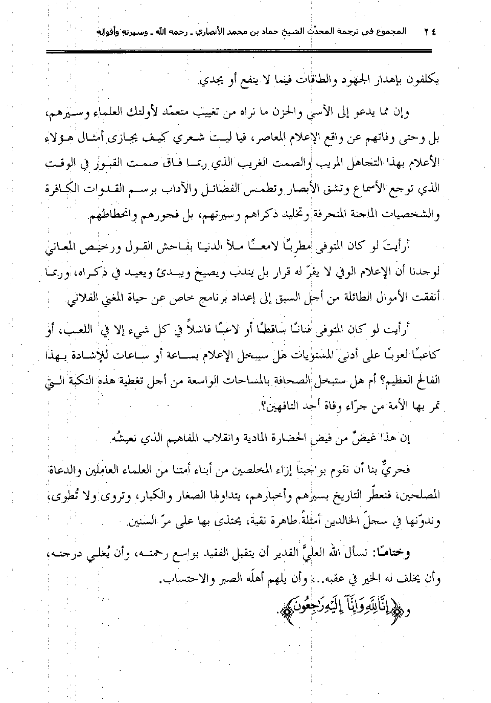 أرأيتَ لو كان المتوفى مطرِبا لامعا ملأ الدنيا بفاحش القول ورخيص المعاني لوجدنا أن الإعلام الوفي لا يقرّ له قرار بل يندب ويصيح ويبدئ ويعيد في ذكراه، وربما أنفقت الأموال الطائلة من أجل السبق إلى إعداد برنامج خاص عن حياة المغني الفلاني.