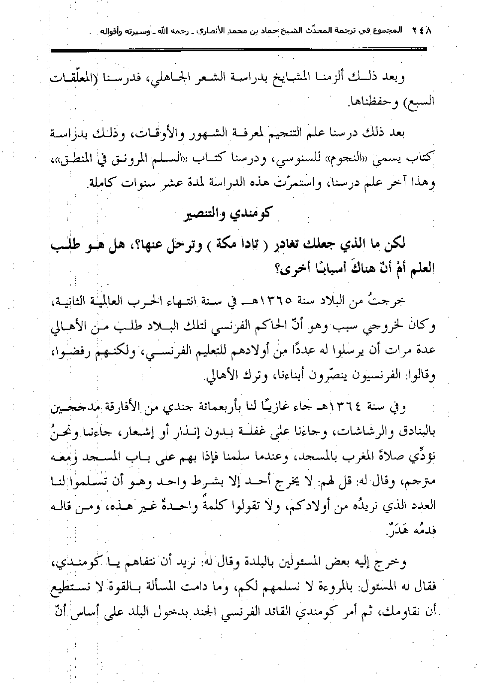 خرجتُ من البلاد سنة 1365هـ في سنة انتهاء الحرب العالمية الثانية؛ وكان لخروجي سبب وهو أنّ الحاكم الفرنسي لتلك البلاد طلب من الأهالي عدة مرات أن يرسلوا له عددًا من أولادهم للتعليم الفرنسي، ولكنهم رفضوا، وقالوا: الفرنسيون ينصّرون أبناءنا؛ وترك الأهالي.