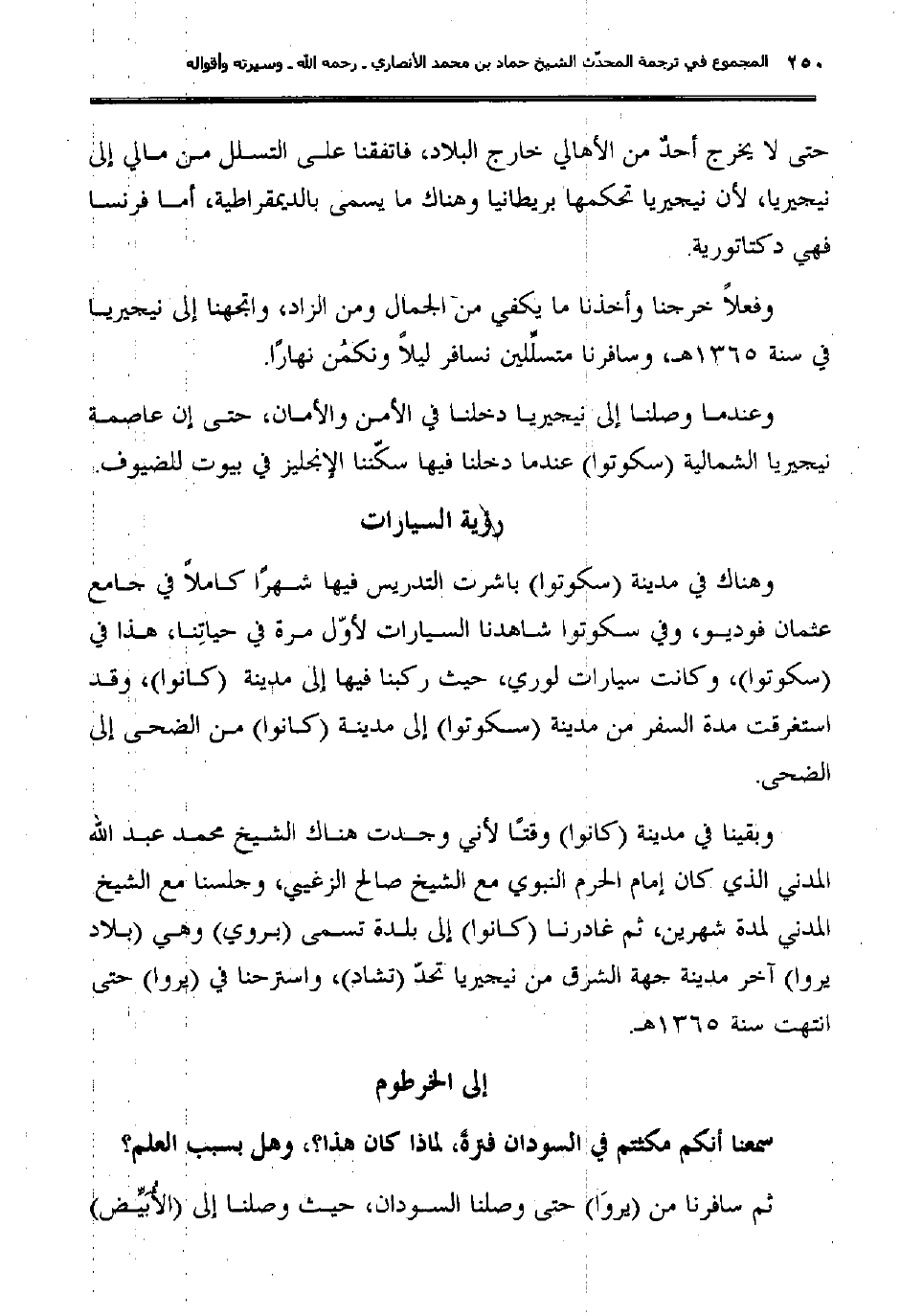 وفعلاً خرجنا وأخذنا ما يكفي من الجمال ومن الزاد، واتجهنا إلى نيجيريا في سنة 1365هـ، وسافرنا متسلِّلين نسافر ليلاً ونكمُن نهارًا.