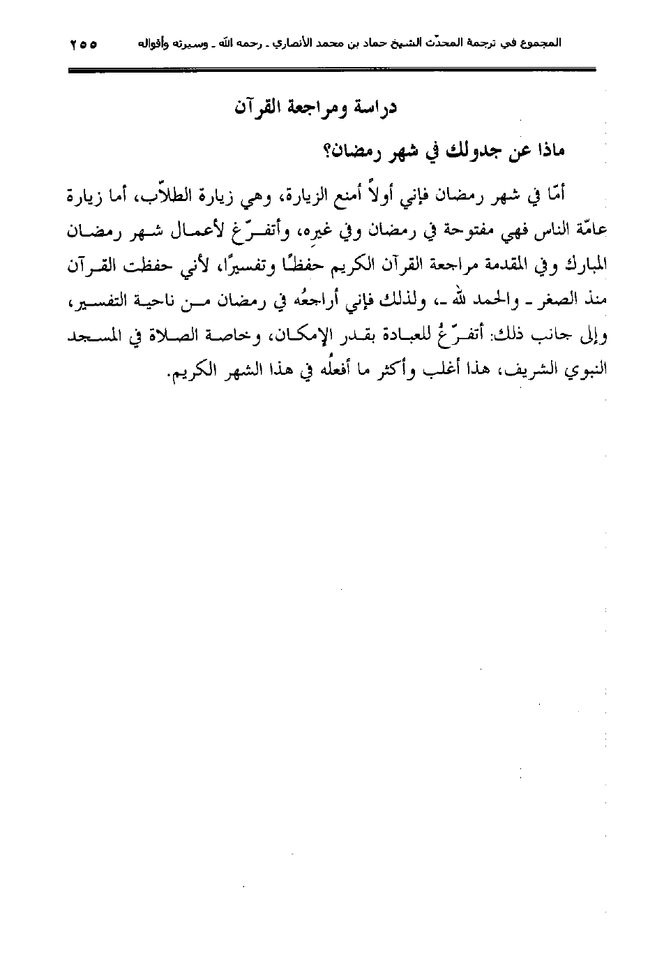 أماني شهر رمضان فإني أولاً أمنع الزيارة، وهي زيارة الطلاّب، أما زيارة عامّة الناس فهي مفتوحة في رمضان وفي غيرِه؛ وأتفرّغ لأعمال شهر رمضان المبارك وفي المقدمة مراجعة القرآن الكريم حفظًا وتفسيرًا؛ لأني حفظت القرآن منذ الصغر "والحمد لله"، ولذلك فإني أراجعُه في رمضان من ناحية التفسير؛ وإلى جانب ذلك: أتفرّغُ للعبادة بقدر الإمكان، وخاصة الصلاة في المسجد النبوي الشريف؛ هذا أغلب وأكثر ما أفعلُه في هذا الشهر الكريم.