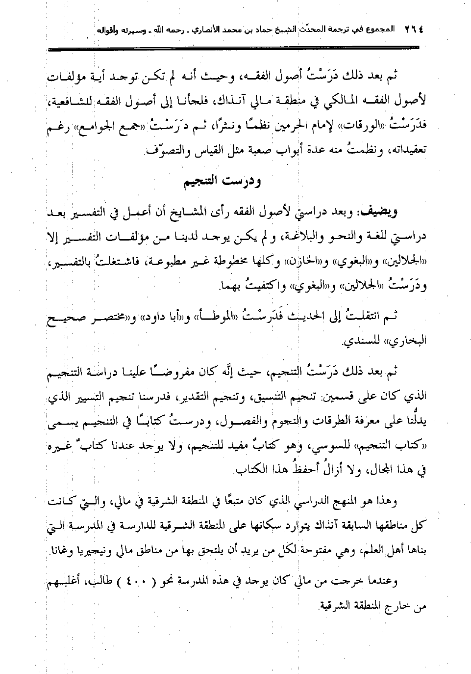 ثم بعد ذلك درست التنجيم؛ حيث أنه كان مفروضا علينا دراسة التنجيم الذي كان على قسمين: تنجيم التنسيق، وتنجيم التقدير؛ فدرسنا تنجيم التنسيق الذي يدلُّنا على معرفة الطرقات والنجوم والفصول؛ ودرستُ كتابا في التنجيم يسمى كتاب التنجيم للأسوقي؛ وهو كتابٌ مفيد للتنجيم، ولا يوجد عندنا كتابٌ غيره في هذا المجال؛ ولا أزالُ أحفظُ هذا الكتاب.