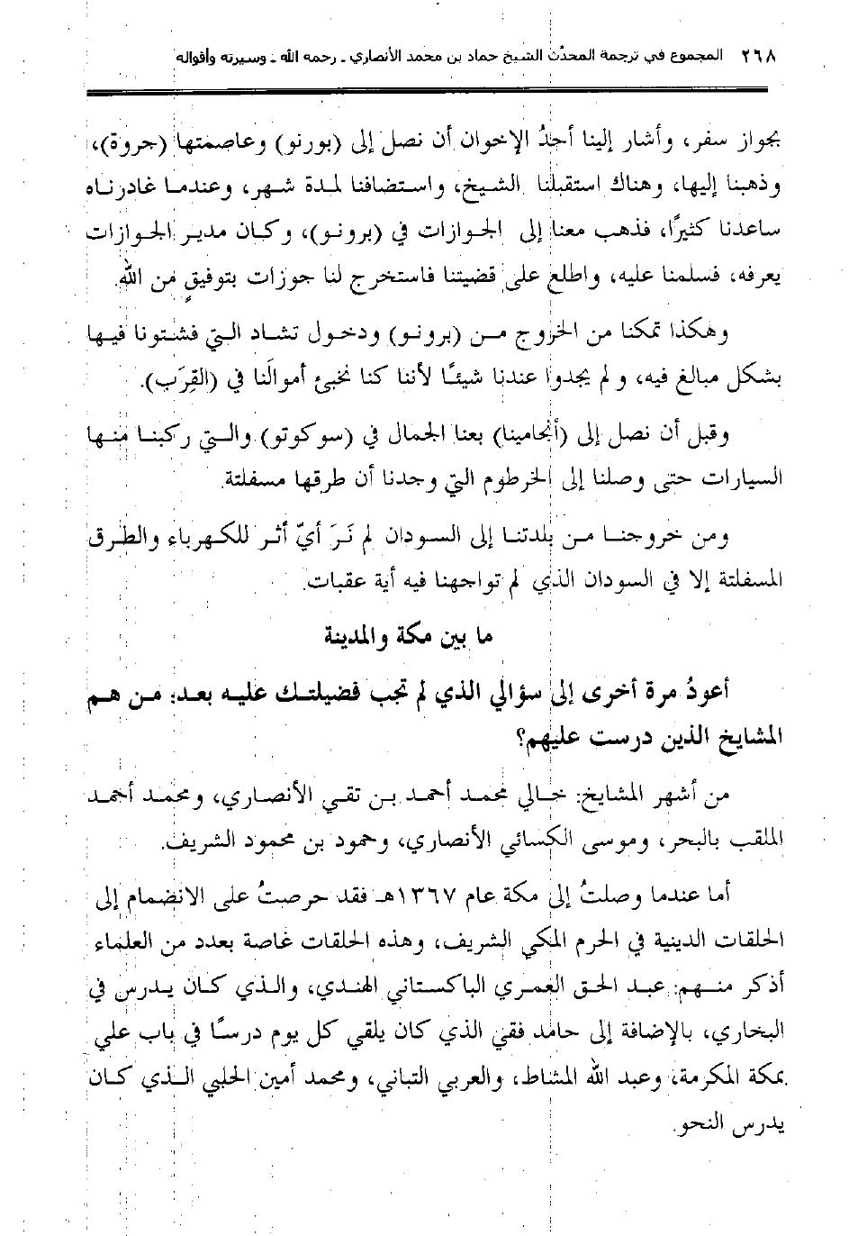 بجواز سفر، وأشار إلينا أحدُ الإخوان أن نصل إلى بورنو وعاصمتها جروة؛ وذهبنا إليها، وهناك استقبلنا الشيخ، واستضافنا لمدة شهر، وعندما غادرناه ساعدنا كثيرًا؛ فذهب معنا إلى الجوازات في (برنو) ، وكان مدير الجوازات الأنصاري الذي سلمنا عليه، واطلع على قضيتنا فاستخرج لنا جوزات بتوفيقٍ من الله.