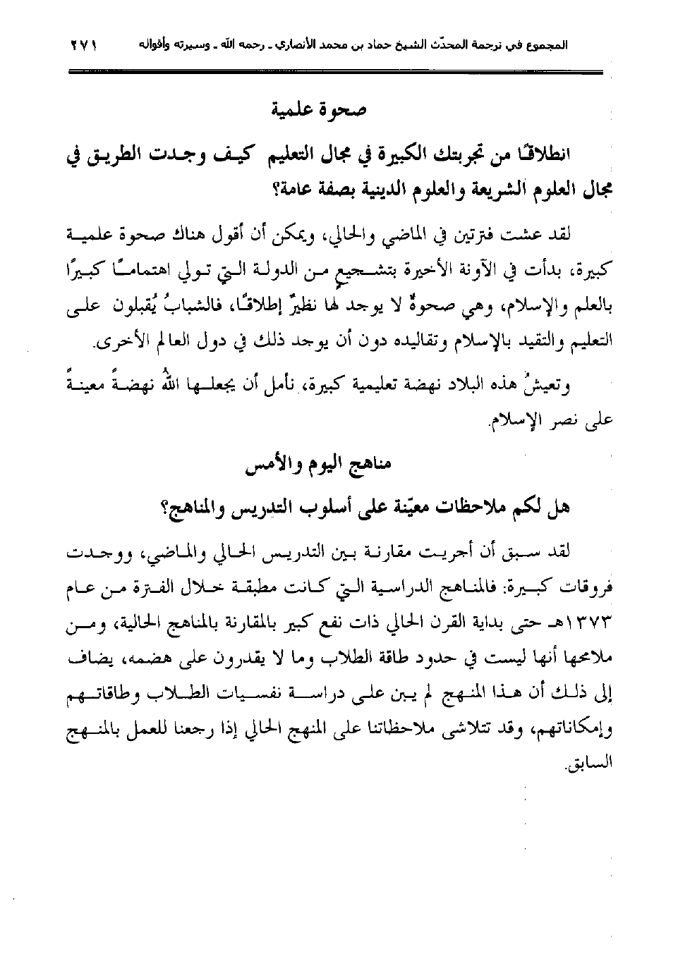 لقد عشت فترتين في الماضي والحالي، ويمكن أن أقول هناك صحوة عليمة كبيرة، بدأت في الآونة الأخيرة بتشجيعٍ من الدولة التي تولي اهتماما كبيرًا بالعلم والإسلام؛ وهي صحوةٌ لا يوجد لها نظيرٌ إطلاقا؛ فالشبابُ يُقبلون على التعليم والتقيد بالإسلام وتقاليده دون أن يوجد ذلك في دول العالم الأخرى.