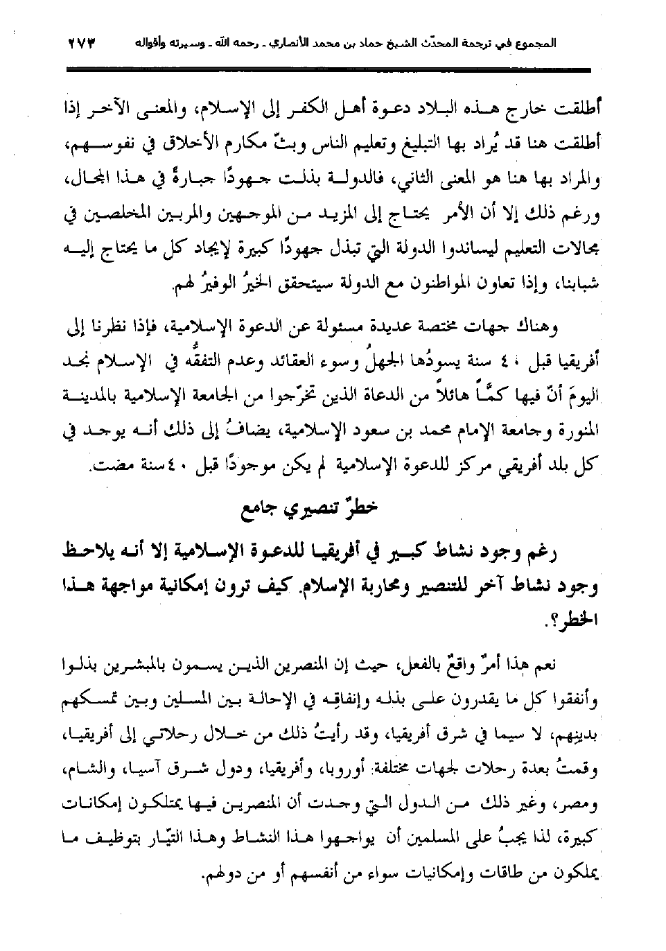 وهناك جهات مختصة عديدة مسئولة عن الدعوة الإسلامية؛ فإذا نظرنا إلى أفريقيا قبل التي كانت قبل 40 سنة يسودُها الجهلُ وسوء العقائد وعدم التفقُّه في الإسلام نجد اليومَ أنّ فيها كما هائلاً من الدعاة الذين تخرّجوا من الجامعة الإسلامية بالمدينة المنورة وجامعة الإمام محمد بن سعود الإسلامية؛ يضافُ إلى ذلك أنه يوجد في كل بلد أفريقي مركز للدعوة الإسلامية لم يكن موجودًا قبل 40سنة مضت.