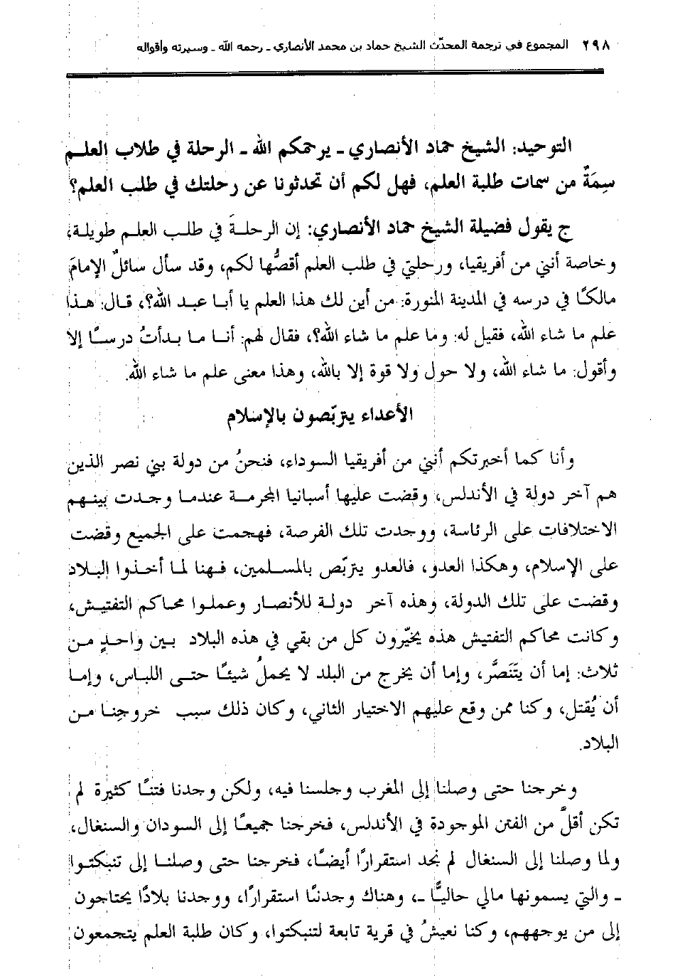 ج يقول فضيلة الشيخ حماد الأنصاري: إن الرحلةَ في طلب العلم طويلة، وخاصة أنني من أفريقيا، ورحلتي في طلب العلم أقصُّها لكم؛ وقد سأل سائلٌ الإمامَ مالكًا في درسه في المدينة المنورة: من أين لك هذا العلم يا أبا عبد الله؟، قال: هذا علم ما شاء الله، فقيل له: وما علم ما شاء الله؟، فقال لهم: أنا ما بدأتُ درساً إلا وأقول: ما شاء الله، ولا حول ولا قوة إلا بالله؛ وهذا معنى علم ما شاء الله.
