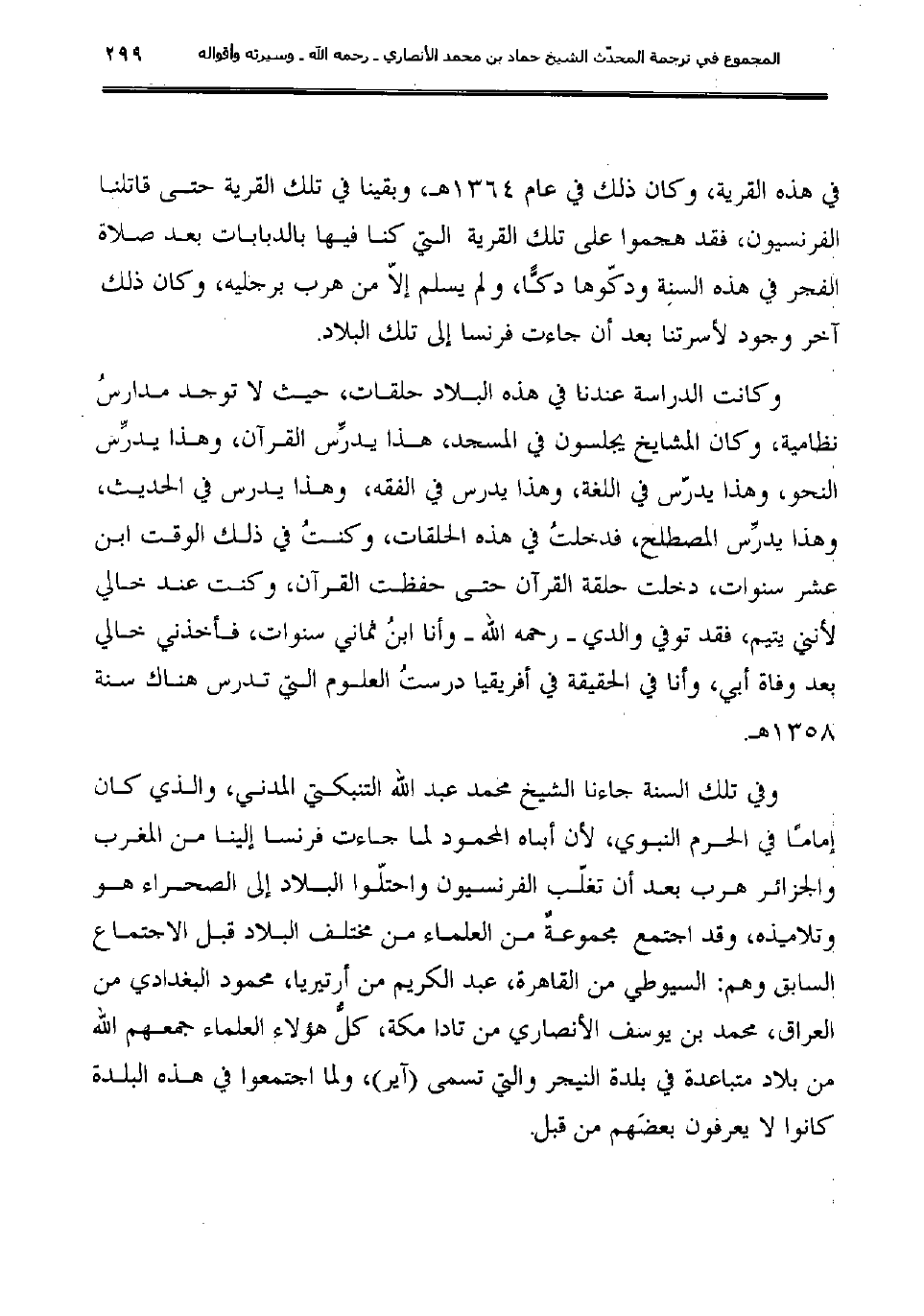 في هذه القرية؛ وكان ذلك في عام 1364هـ، وبقينا في تلك القرية حتى قاتلنا الفرنسيون؛ فقد هجموا على تلك القرية التي كنا فيها بالدبابات بعد صلاة الفجر في هذه السنة ودكّوها دكًّا، ولم يسلم إلاّ من هرب برجليه؛ وكان ذلك آخر وجود لأسرتنا بعد أن جاءت فرنسا إلى تلك البلاد.