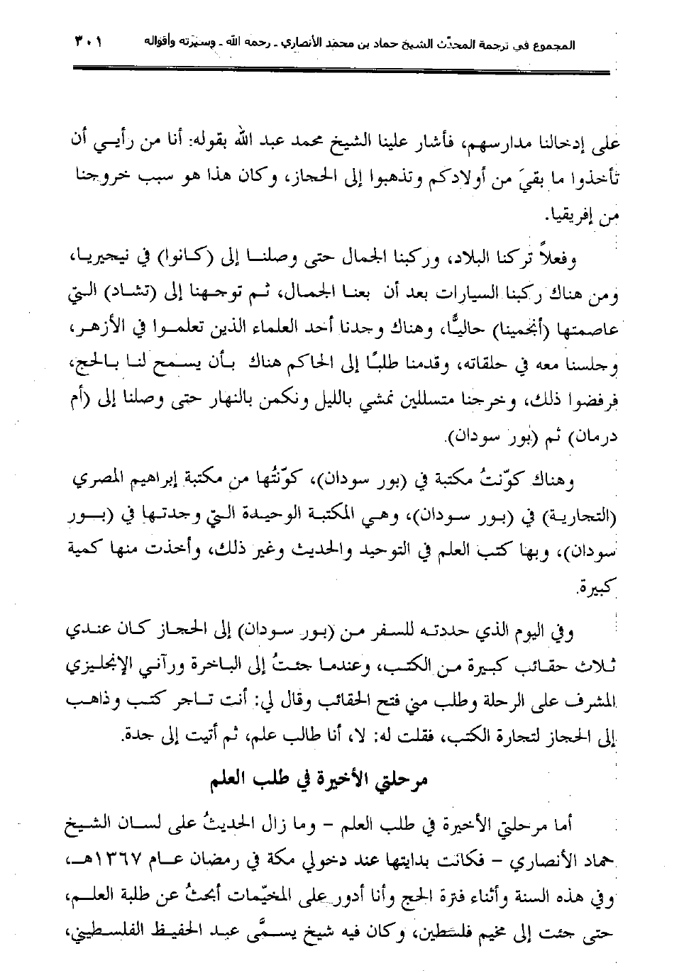 أما مرحلتي الأخيرة في طلب العلم - وما زال الحديثُ على لسان الشيخ حماد الأنصاري - فكانت بدايتها عند دخولي مكة في رمضان عام 1367هـ عام 148م؛ وفي تلك السنة وأثناء فترة الحج وأنا أدور على المخيّمات أبحثُ عن طلبة العلم، حتى جئت إلى مخيم فلسطين، وكان فيه شيخ يسمَّى عبد الحفيظ الفلسطيني،