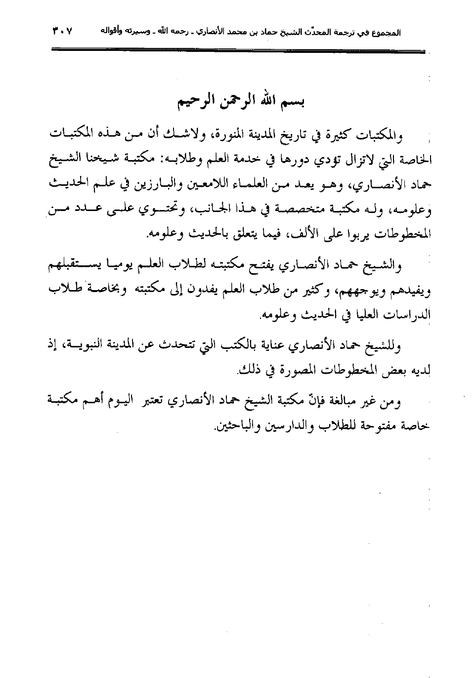 والمكتبات كثيرة في تاريخ المدينة المنورة، ولاشك أن من هذه المكتبات الخاصة التي لا تزال تؤدي دورها في خدمة العلم وطلابه: مكتبة شيخنا الشيخ حماد الأنصاري، وهو يعد من العلماء اللامعين والبارزين في علم الحديث وعلومه.. وله مكتبه متخصصة في هذا الجانب.. وتحتوي على عدد من المخطوطات يربوا على الألف، فيما يتعلق بالحديث وعلومه.