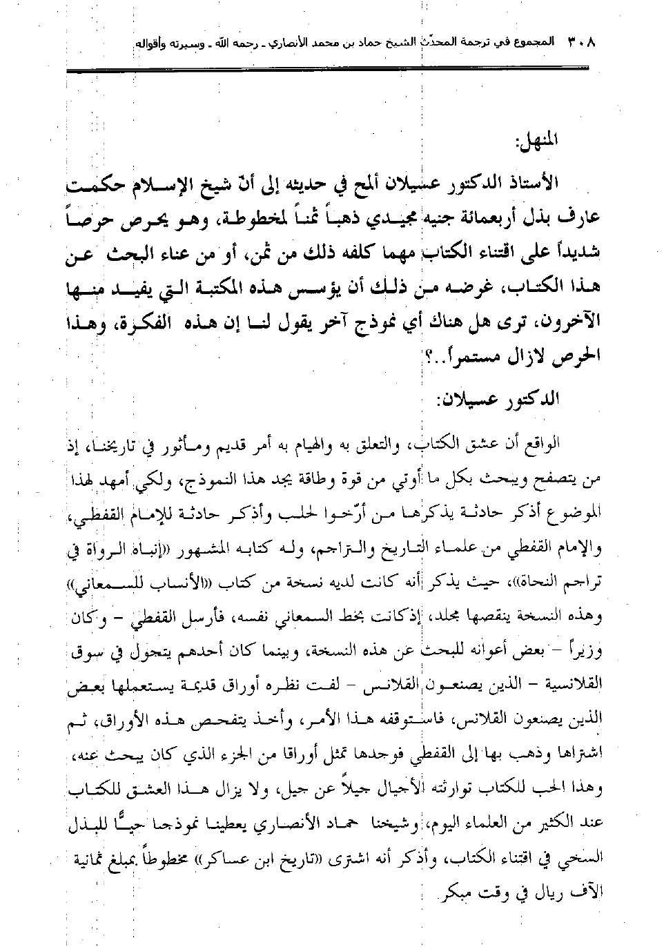 الواقع أن عشق الكتاب، والتعلق به والهيام به أمر قديم ومأثور في تاريخنا، إذ من يتصفح ببحث عن كل ما أوتي من قوة وطاقة، ولكي أمهد لهذا الموضوع أذكر حادثة يذكرها من أرّخوا لحلب وذكرت حادثة للإمام القفطي، والإمام القفطي من علماء التاريخ والتراجم، وله كتابه المشهور "إنباه الرواة في تراجم النحاة"، ويذكر أنه كانت لديه نسخة من كتاب "الأنساب للسمعاني" وهذه النسخة ينقصها مجلد، إذكانت بخط السمعاني نفسه، فأرسل القفطي -وكان وزيرا- بعض أعوانه للبحث عن هذه النسخة، وبينما كان أحدهم يتجول في سوق القلانسية -الذين يصنعون القلانس- لفت نظره أوراق قديمة يستعملها بعض الذين يصنعون القلانس، فاستوقفه هذا الأمر، وأخذ يتفحص هذه الأوراق، ثم اشتراها وذهب بها إلى القفطي فوجدها تمثل أوراقا من الجزء الذي كان يبحث. وهذا الحب للكتاب توارثته الأجيال جيلا عن جيل، ولا يزال هذا العشق للكتاب عند الكثير من العلماء اليوم، وشيخنا حماد الأنصاري يعطينا نموذجا حيًّا للبذل السخي في اقتناء الكتاب.