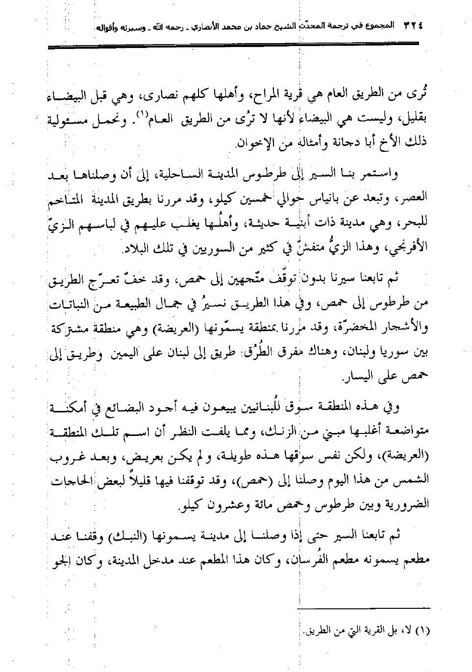 وفي هذه المنطقة سوق للُبنانيين يبيعون فيه أجود البضائع في أمكنة متواضعة أغلبها مبني من الزنك، ومما يلفت النظر أن اسم تلك المنطقة (العريضة) ، ولكن نفس سوقها هذه طويلة، ولم يكن بعريض، وبعد غروب الشمس من هذا اليوم وصلنا إلى (حمص) ، وقد توقفنا فيها قليلاً لبعض الحاجات الضرورية وبين طرطوس وحمص مائة وعشرون كيلو.