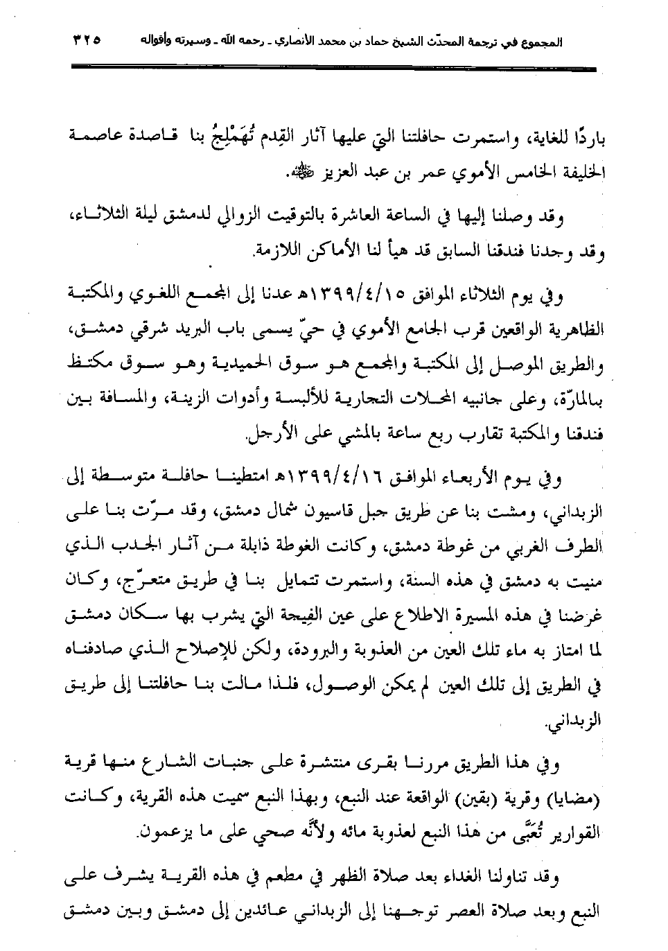 وفي يوم الأربعاء الموافق 16/4/1399هـ امتطينا حافلة متوسطة إلى الزبداني، ومشت بنا عن طريق جبل قاسيون شمال دمشق، وقد مرّت بنا على الطرف الغربي من غوطة دمشق، وكانت الغوطة ذابلة من آثار الجدب الذي منيت به دمشق في هذه السنة، واستمرت تتمايل بنا في طريق متعرّج، وكان غرضنا في هذه المسيرة الاطلاع على عين الفِيجة التي يشرب بها سكان دمشق لما امتاز به ماء تلك العين من العذوبة والبرودة، ولكن للإصلاح الذي صادفناه في الطريق إلى تلك العين لم يمكن الوصول، فلذا مالت بنا حافلتنا إلى طريق الزبداني.
