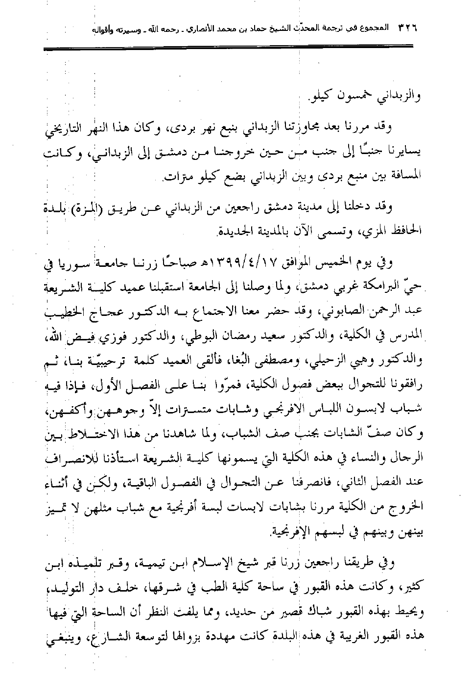وفي يوم الخميس الموافق 17/4/1399هـ صباحاً زرنا جامعة سوريا في حيّ البرامكة غربي دمشق، ولما وصلنا إلى الجامعة استقبلنا عميد كلية الشريعة عبد الرحمن الصابوني، وقد حضر معنا الاجتماع به الدكتور عجاج الخطيب المدرس في الكلية، والدكتور سعيد رمضان البوطي، والدكتور فوزي فيض الله، والدكتور وهبي الرحيلي، ومصطفى البُغا، فألقى العميد كلمة ترحيبيّة بنا، ثم رافقونا للتجوال ببعض فصول الكلية، فمرّوا بنا على الفصل الأول، فإذا فيه شباب لابسون اللباس الافرنجي وشابات متسترات إلاّ وجوههن وأكفهن، وكان صفّ الشابات بجنب صف الشباب، ولما شاهدنا من هذا الاختلاط بين الرجال والنساء في هذه الكلية التي يسمونها كلية الشريعة استأذنا للانصراف عند الفصل الثاني، فانصرفنا عن التجوال في الفصول الباقية، ولكن في أثناء الخروج من الكلية مررنا بشابات لابسات لبسة أفرنجية مع شباب مثلهن لا تميز بينهن وبينهم في لبسهم الإفرنجية.