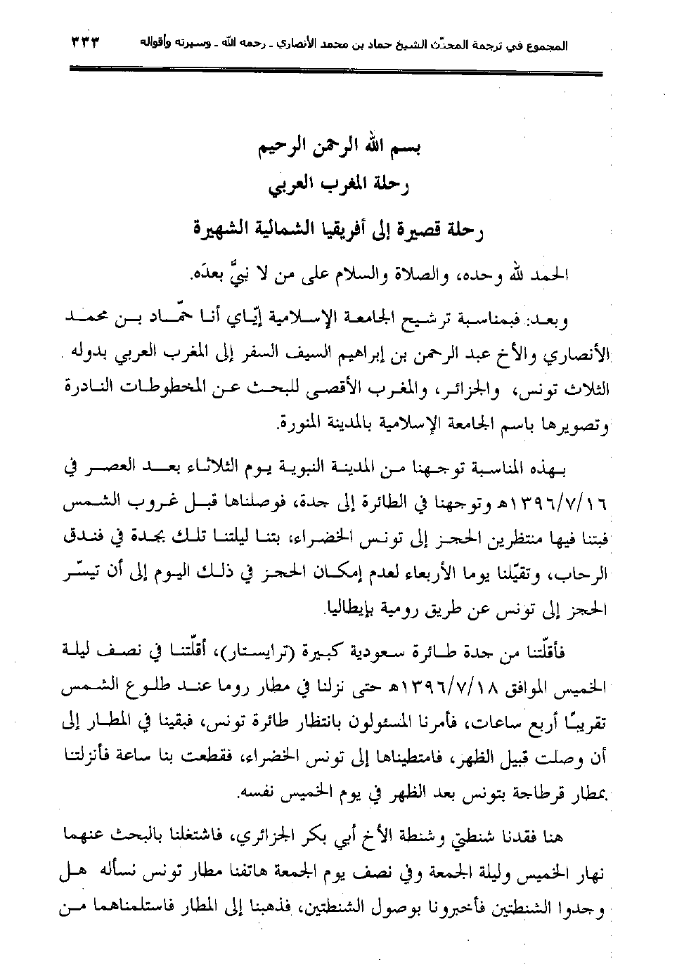 وبعد: فبمناسبة ترشيح الجامعة الإسلامية إيّاي أنا حمّاد بن محمد الأنصاري والأخ عبد الرحمن بن إبراهيم السيف السفر إلى المغرب العربي بدوله الثلاث تونس، والجزائر، والمغرب الأقصى للبحث عن المخطوطات النادرة وتصويرها باسم الجامعة الإسلامية بالمدينة المنورة.