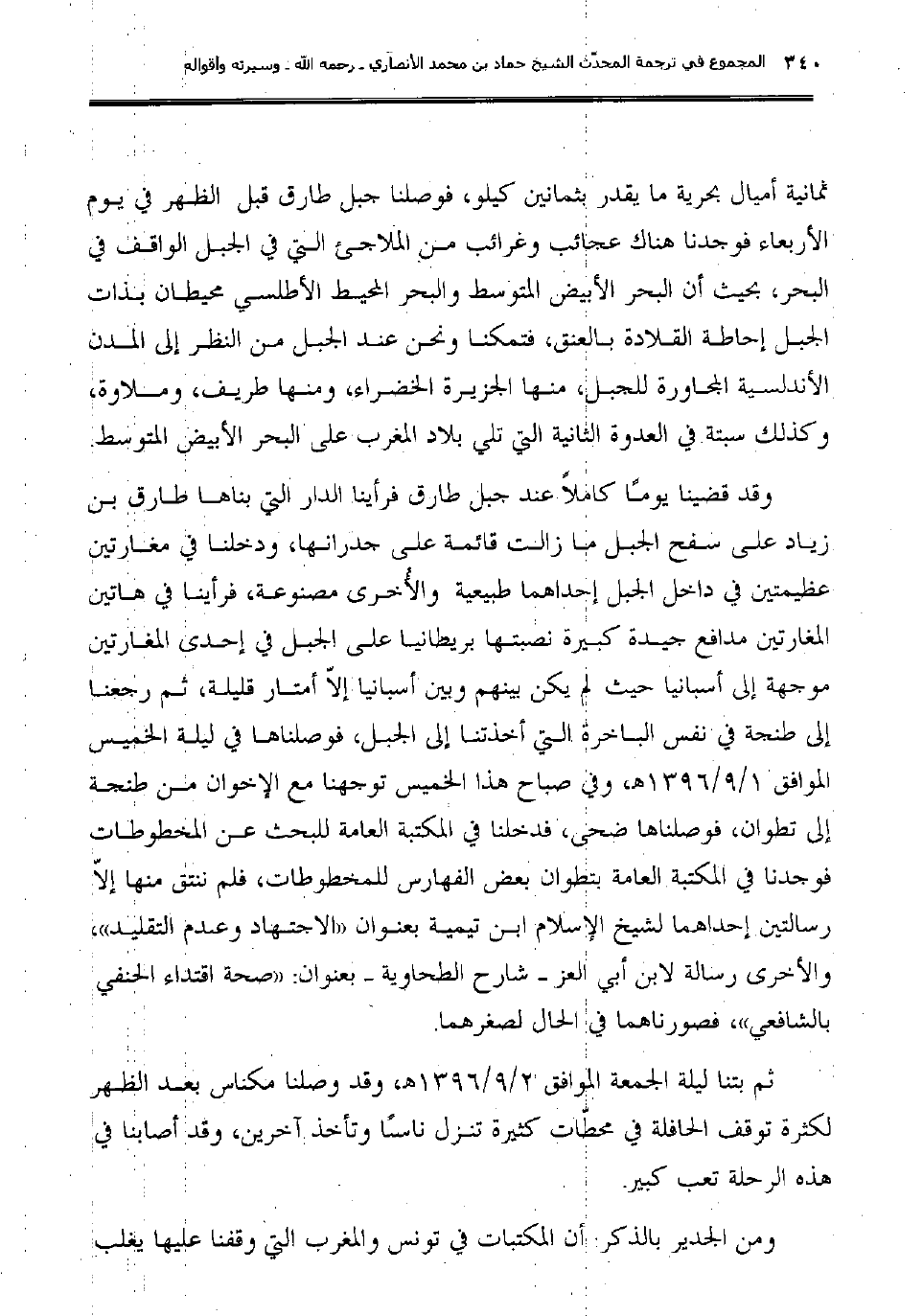 وقد قضينا يومًا كاملاً عند جبل طارق فرأينا الدار التي بناها طارق بن زياد على سفح الجبل ما زالت قائمة على جدرانها، ودخلنا في مغارتين عظيمتين في داخل الجبل إحداهما طبيعية والأُخرى مصنوعة، فرأينا في هاتين المغارتين مدافع جيدة كبيرة نصبتها بريطانيا على الجبل في إحدى المغارتين موجهة إلى أسبانيا حيث لم يكن بينهم وبين أسبانيا إلاّ أمتار قليلة، ثم رجعنا إلى طنجة في نفس الباخرة التي أخذتنا إلى الجبل، فوصلناها في ليلة الخميس الموافق 1/9/1396هـ، وفي صباح هذا الخميس توجهنا مع الإخوان من طنجة إلى تطوان، فوصلناها ضحى، فدخلنا في المكتبة العامة للبحث عن المخطوطات فوجدنا في المكتبة العامة بتطوان بعض الفهارس للمخطوطات، فلم ننتق منها إلاّ رسالتين إحداهما لشيخ الإسلام ابن تيمية بعنوان (الاجتهاد وعدم التقليد) ، والأخرى رسالة لابن أبي العز شارح الطحاوية بعنوان: (صحة اقتداء الحنفي بالشافعي) ، فصورناهما في الحال لصغرهما.