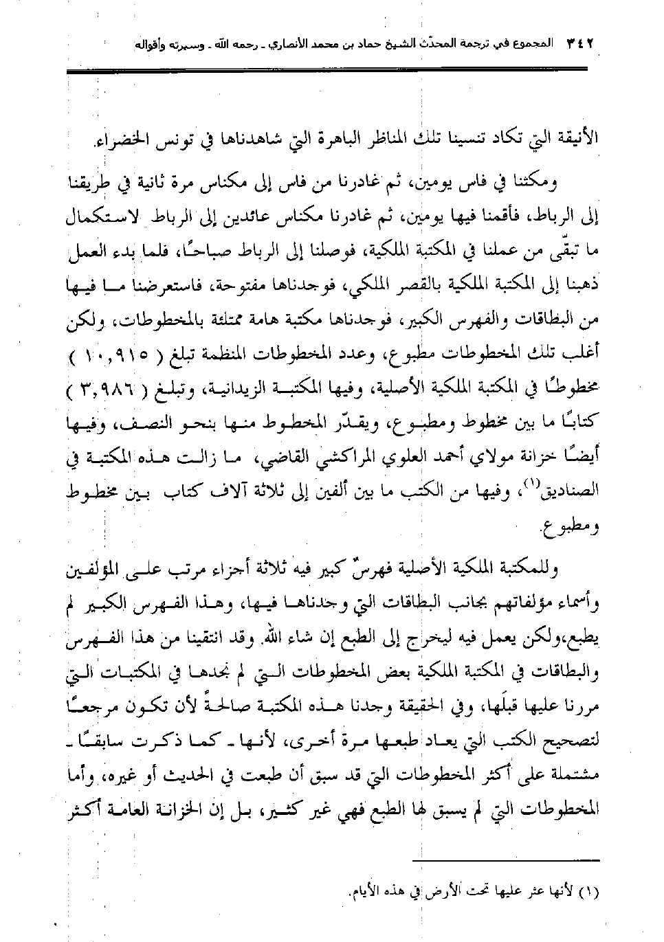 ومكثنا في فاس يومين، ثم غادرنا من فاس إلى مكناس مرة ثانية في طريقنا إلى الرباط، فأقمنا فيها يومين، ثم غادرنا مكناس عائدين إلى الرباط لاستكمال ما تبقّى من عملنا في المكتبة الملكية، فوصلنا إلى الرباط صباحاً، فلما بدء العمل ذهبنا إلى المكتبة الملكية بالقصر الملكي، فوجدناها مفتوحة، فاستعرضنا ما فيها من البطاقات والفهرس الكبير، فوجدناها مكتبة هامة ممتلئة بالمخطوطات، ولكن أغلب تلك المخطوطات مطبوع، وعدد المخطوطات المنظمة تبلغ (10.915) مخطوطًا في المكتبة الملكية الأصلية، وفيها المكتبة الزيدانية، وتبلغ (3.986) كتابًا ما بين مخطوط ومطبوع، ويقدّر المخطوط منها بنحو النصف، وفيها أيضًا خزانة مولاي أحمد العلوي المراكشي القاضي، ما زالت هذه المكتبة في الصناديق (1) ، وفيها من الكتب ما بين ألفين إلى ثلاثة آلاف كتاب بين مخطوط ومطبوع.