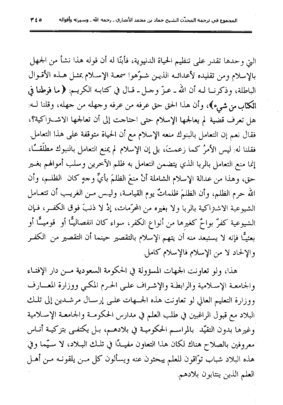التي وحدها تقدر على تنظيم الحياة الدنيوية، فأبنّا له أن قوله هذا نشأ من الجهل بالإسلام ومن تقليده لأعدائه الذين شوّهوا سمعة الإسلام بمثل هذه الأقوال الباطلة، وذكرنا له أن الله عزّ وجل قال في كتابه الكريم: {ما فرطنا في الكتاب من شيء} ، وأن هذا الحق حق عرفه من عرفه وجهله من جهله، وقلنا له: هل تعرف قضية لم يعالجها الإسلام حتى احتاجت إلى أن تعالجها الاشتراكية؟، فقال نعم إن التعامل بالبنوك منعه الإسلام مع أن الحياة متوقفة على هذا التعامل. فقلنا له: ليس الأمرُ كما زعمتَ، بل إن الإسلام لم يمنع التعامل بالنبوك مطلَقا، إنما منع التعامل بالربا الذي يتضمن التعامل به ظلم الآخرين وسلب أموالهم بغير حق، وهذا من عدالة الإسلام الشاملة أنْ منعَ الظلمَ بأيِّ وجهٍ كان الظلم، وأن الله حرم الظلم، وأن الظلمَ ظلماتٌ يوم القيامة، وليس من الغريب أن تتعامل الشيوعية الاشتراكية بالربا ولا بغيره من المحرّمات، إذْ لا ذنبَ فوق الكفر، فإن الشيوعية كفرٌ بواحٌ كغيرِها من أنواع الكفر، سواء كان انفصاليا أو قوميا أو بعثيا فإنه لا يستبعد منه أن يتهم الإسلام بالتقصير حينما أن التقصير من الكفر والإلحاد لا من الإسلام فالإسلام كامل.