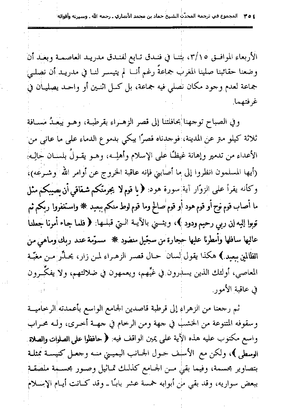 ثم رجعنا من الزهراء إلى قرطبة قاصدين الجامع الواسع بأعمدته الرخامية وسقوفه المتنوعة من الخشب في جهة ومن الرخام في جهة أخرى، وله محراب واسع مكتوب عليه هذه الآية على يمين الواقف فيه: {حافظوا على الصلوات والصلاة الوسطى} ، ولكن مع الأسف حول الجانب اليميني منه وجعل كنيسة ممثلة بتصاوير مجسمة، وفيما بقي من الجامع كذلك تماثيل وصور مجسمة ملصقة ببعض سواريه، وقد بقي من أبوابه خمسة عشر بابا وقد كانت أيام الإسلام
