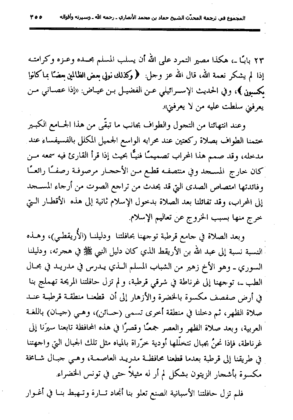 وبعد الصلاة في جامع قرطبة توجهنا بحافلتنا ودليلنا (الأُريقطي) ، وهذه النسبة نسبة إلى عبد الله بن الأريقط الذي كان دليل النبي صلى الله عليه وسلم في هجرته، ودليلنا السوري وهو الأخ زهير من الشباب المسلم الذي يدرس في مدريد في مجال الطب، توجهنا إلى غرناطة في شرقي قرطبة، ولم تزل حافلتنا المريحة تهملج بنا في أرض صفصف مكسوة بالخضرة والأزهار إلى أن قطعنا منطقة قرطبة عند صلاة الظهر، ثم دخلنا في منطقة أخرى تسمى (حائن) ، وهي (جيان) باللغة العربية، وبعد صلاة الظهر والعصر جمعًا وقصرًا في هذه المحافظة تابعنا سيرَنا إلى غرناطة، فإذا نحنُ بجبال تتخلّلها أودية خرّراة بالمياه مثل تلك الجبال التي واجهتنا في طريقنا إلى قرطبة بعدما قطعنا محافظة مدريد العاصمة، وهي جبال شامخة مكسوة بأشجار الزيتون بشكل لم أر له مثيلاً حتى في تونس الخضراء.