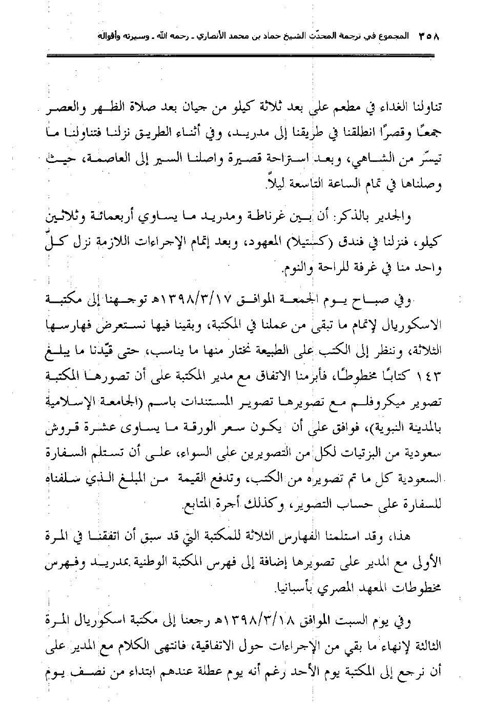 وفي صباح يوم الجمعة الموافق 17/3/1398هـ توجهنا إلى مكتبة الاسكوريال لإتمام ما تبقى من عملنا في المكتبة، وبقينا فيها نستعرض فهارسها الثلاثة، وننظر إلى الكتب على الطبيعة نختار منها ما يناسب، حتى قيّدنا ما يبلغ 143 كتابا مخطوطًا، فأبرمنا الاتفاق مع مدير المكتبة على أن تصورها المكتبة تصوير ميكروفلم مع تصويرها تصوير المستندات باسم (الجامعة الإسلامية بالمدينة النبوية) ، فوافق على أن يكون سعر الورقة ما يساوى عشرة قروش سعودية من البزتيات لكل من التصويرين على السواء، على أن تستلم السفارة السعودية كل ما تم تصويره من الكتب، وتدفع القيمة من المبلغ الذي سلفناه للسفارة على حساب التصوير، وكذلك أجرة المتابع.