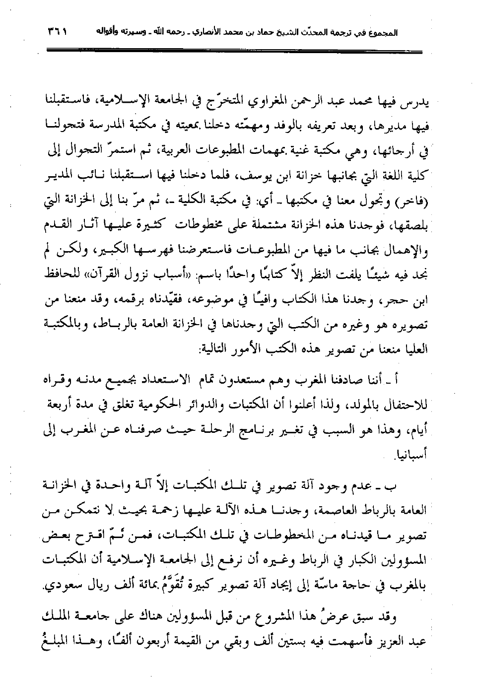 ب- عدم وجود آلة تصوير في تلك المكتبات إلاّ آلة واحدة في الخزانة العامة بالرباط العاصمة، وجدنا هذه الآلة عليها زحمة بحيث لا نتمكن من تصوير ما قيدناه من المخطوطات في تلك المكتبات، فمن ثَمّ اقترح بعض المسؤولين الكبار في الرباط وغيره أن نرفع إلى الجامعة الإسلامية أن المكتبات بالمغرب في حاجة ماسّة إلى إيجاد آلة تصوير كبيرة تُقَوَّمُ بمائة ألف ريال سعودي.