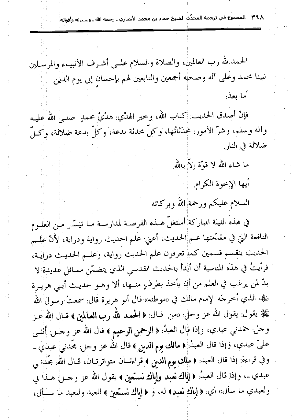 في هذه الليلة المباركة أستغلّ هذه الفرصة لمدارسة ما تيسّر من العلوم النافعة التي في مقدّمتها علم الحديث، أعني: علم الحديث رواية ودراية، لأنّ علم الحديث ينقسم قسمين كما تعرفون علم الحديث رواية، وعلم الحديث دراية، فرأيتُ في هذه المناسبة أن أبدأَ بالحديث القدسي الذي يتضمّن مسائل عديدة لا بدّ لمن يرغب في العلم من أن يأخذ بطرفٍ منها، ألا وهو حديث أبي هريرة رضي الله عنه الذي أخرجَه الإمام مالك في (موطئه) قال أبو هريرة قال: سمعتُ رسول الله صلى الله عليه وسلم يقول: يقول الله عز وجل: "من قال: {الحمد لله رب العالمين} قال الله عز وجل: حمدني عبدي، وإذا قال العبدُ: {الرحمن الرحيم} قال الله عز وجل: أثنى عليّ عبدي، وإذا قال العبدُ: {مالك يوم الدين} قال الله عز وجل: مجّدني عبدي وفي قراءة: إذا قال العبد: {ملك يوم الدين} قراءتان متواترتان، قال الله: مجّدني عبدي، وإذا قال العبدُ: {إياك نعبد وإياك نستعين} يقول الله عز وجل: هذا لي ولعبدي ما سأل" أي: {إياك نعبد} له، و {إياك نستعين} للعبد وللعبد ما سأل،