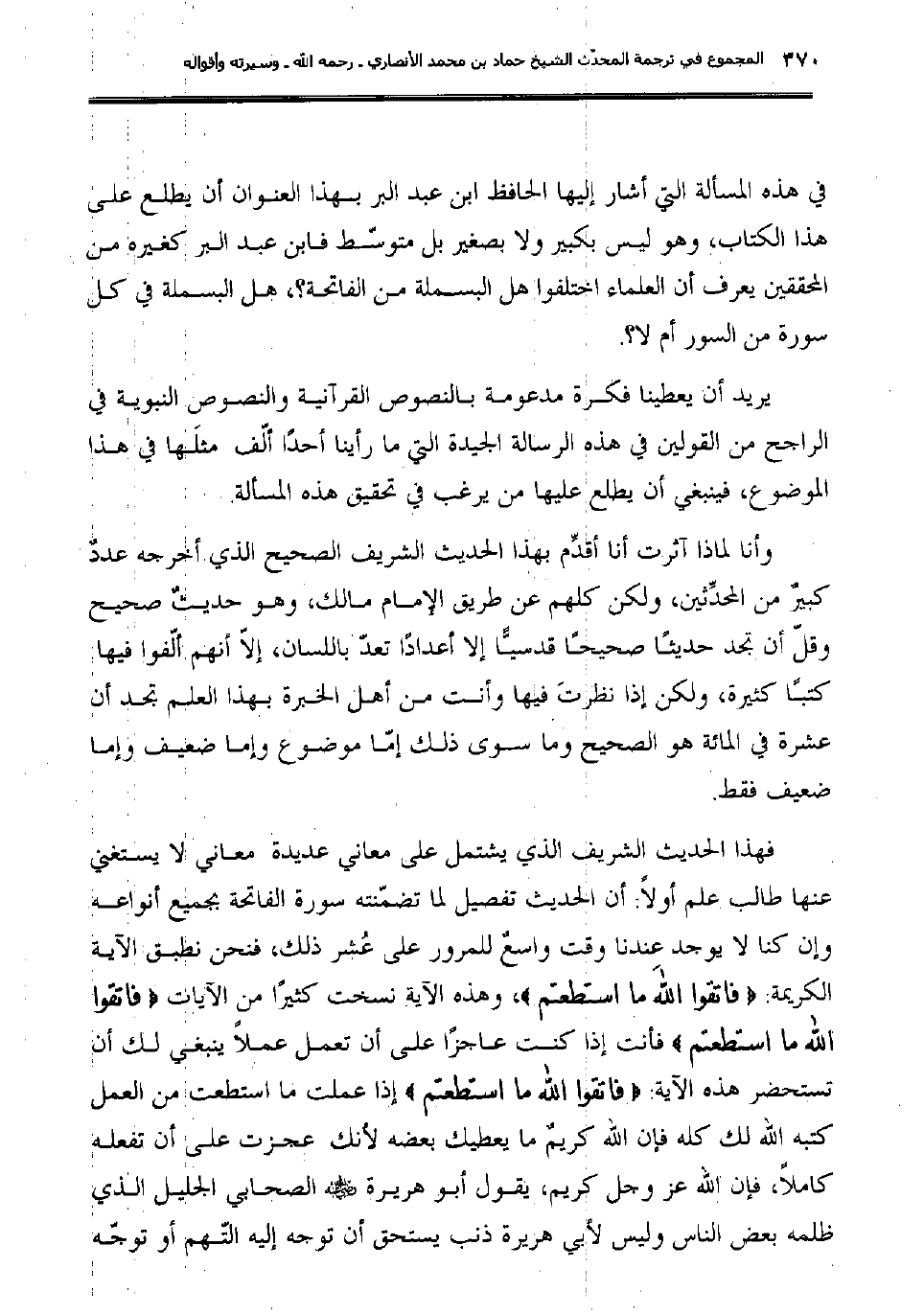 في هذه المسألة التي أشار إليها الحافظ ابن عبد البر بهذا العنوان أن يطلع على هذا الكتاب، وهو ليس بكبير ولا بصغير بل متوسّط فابن عبد البر كغيره من المحققين يعرف أن العلماء اختلفوا هل البسملة من الفاتحة؟، هل البسملة في كل سورة من السور أم لا؟.