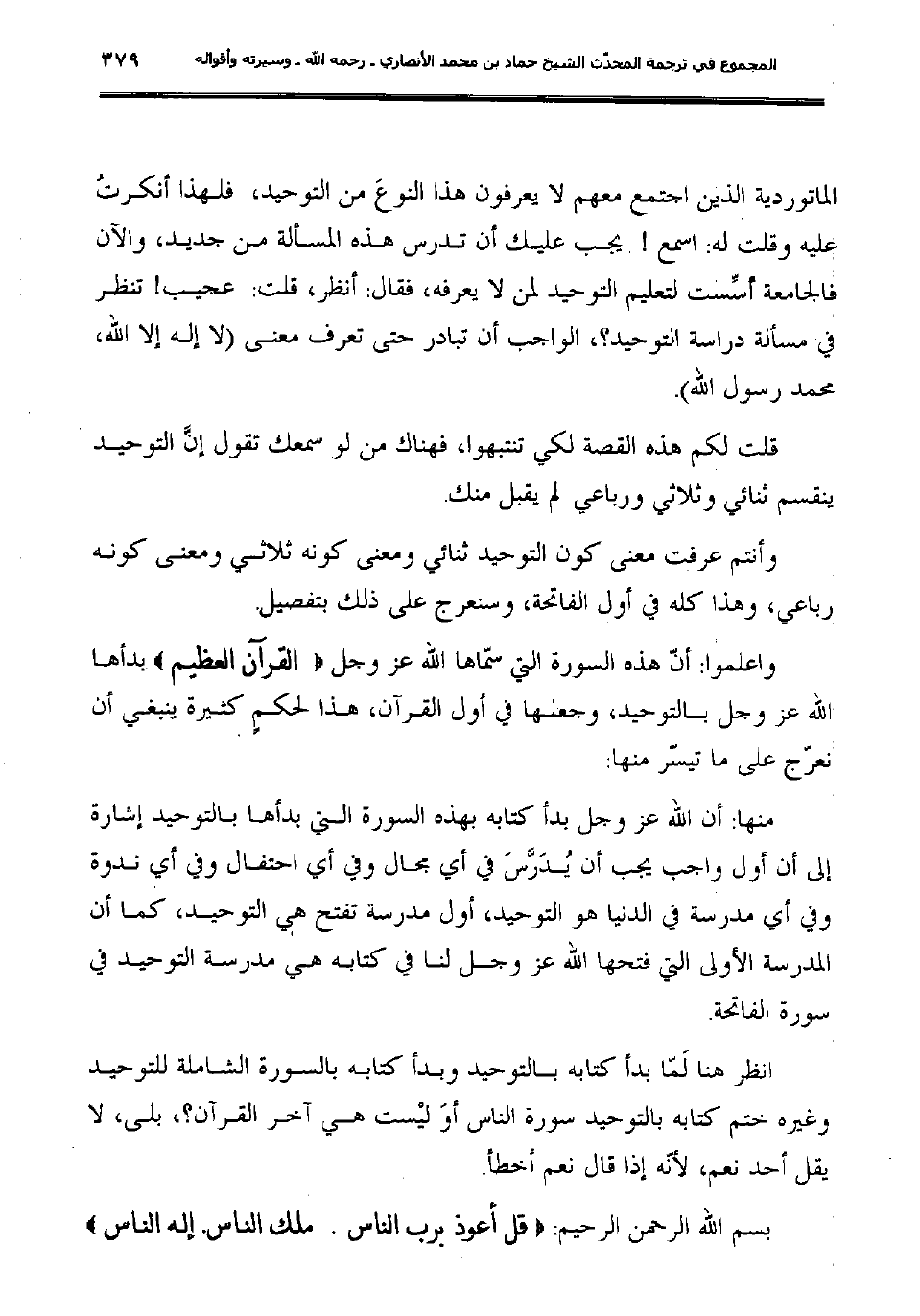 انظر هنا لَمّا بدأ كتابه بالتوحيد وبدأ كتابه بالسورة الشاملة للتوحيد وغيره ختم كتابه بالتوحيد سورة الناس أوَ ليْست هي آخر القرآن؟، بلى، لا يقل أحد نعم، لأنّه إذا قال نعم أخطأ.