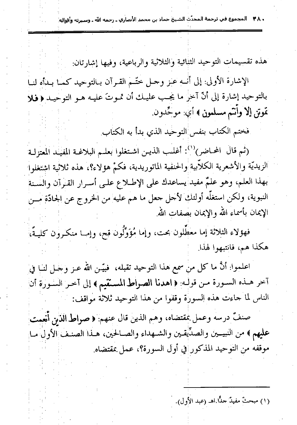 صنفٌ درسه وعمل بمقتضاه، وهم الذين قال عنهم: {صراط الذين أنعمت عليهم} من النبيين والصدِّيقين والشهداء والصالحين، هذا الصنف الأول ما موقفه من التوحيد المذكور في أول السورة؟، عمل بمقتضاه.