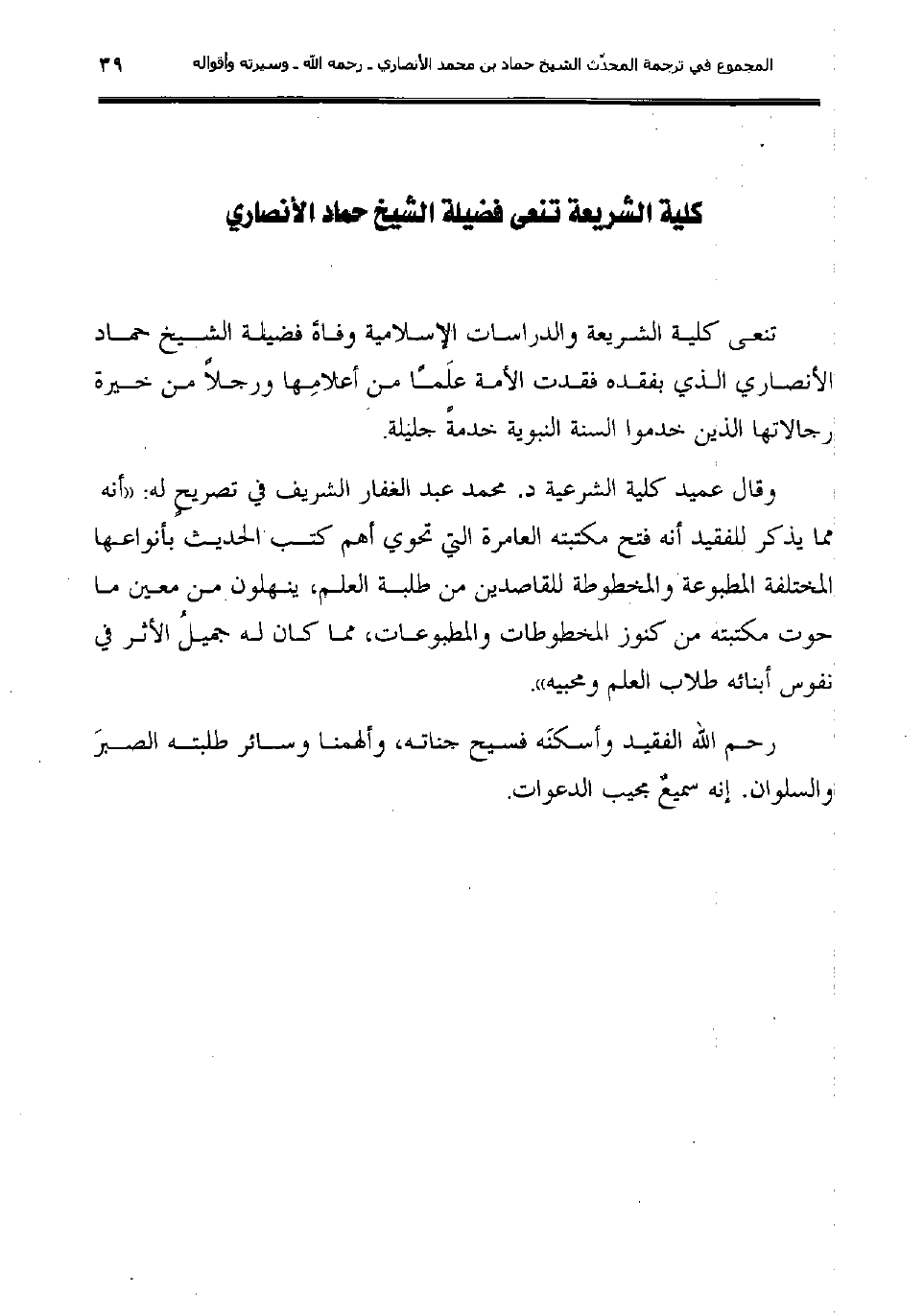 كلية الشريعة تنعى فضيلة الشيخ حماد الأنصاري