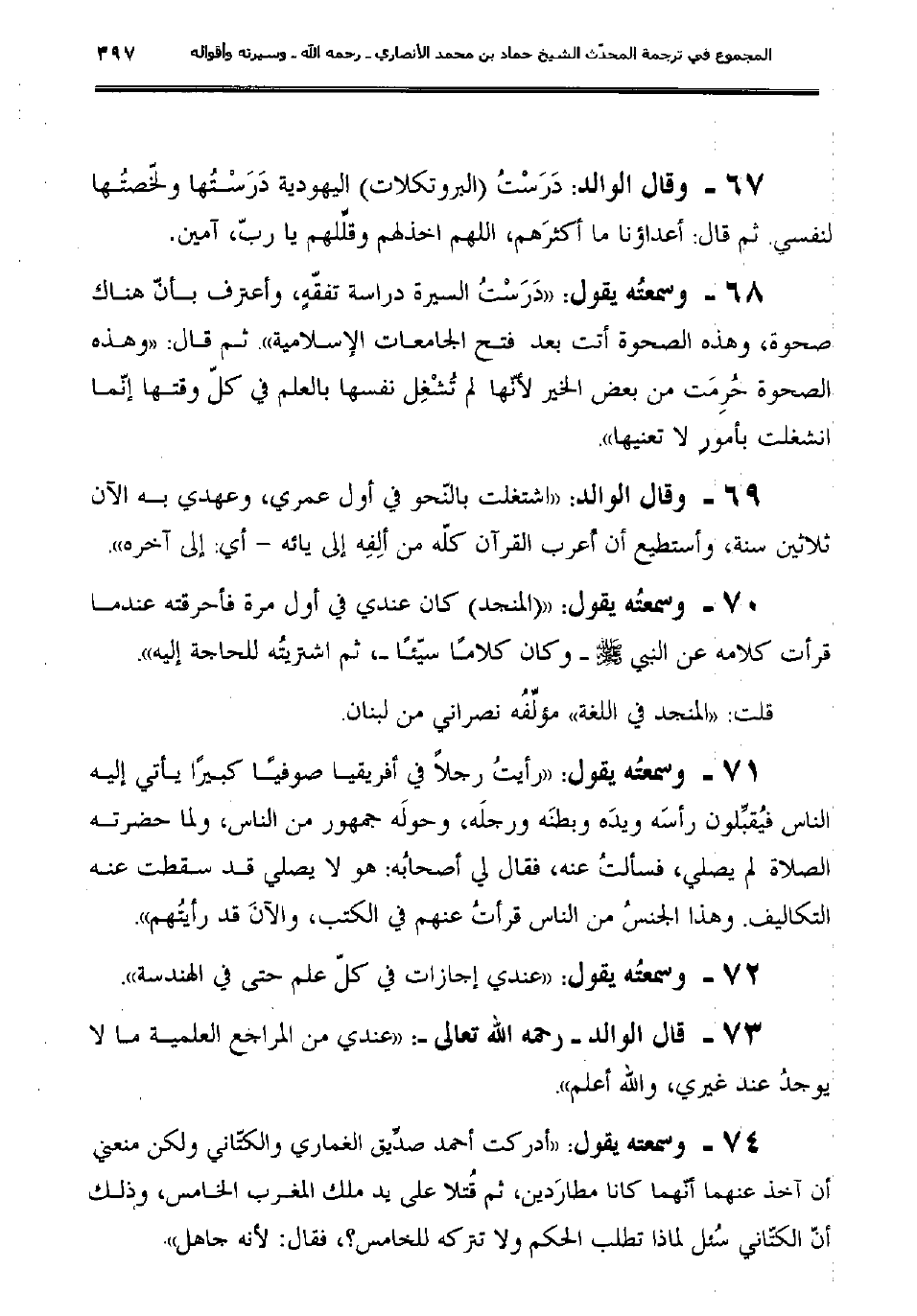 70- وسمعتُه يقول: ""المنجد" كان عندي في أول مرة فأحرقته عندما قرأت كلامه عن النبي صلى الله عليه وسلم وكان كلامًا سيّئًا، ثم اشتريتُه للحاجة إليه".