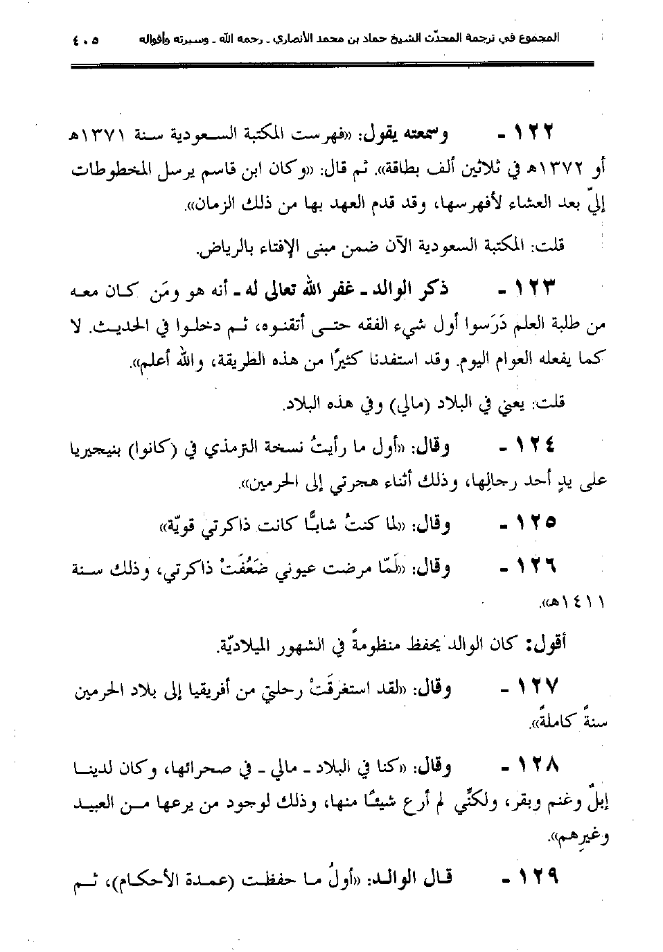 124- وقال: "أول ما رأيتُ نسخة الترمذي في "كانوا" بنيجيريا على يدٍ أحد رجالِها، وذلك أثناء هجرتي إلى الحرمين".