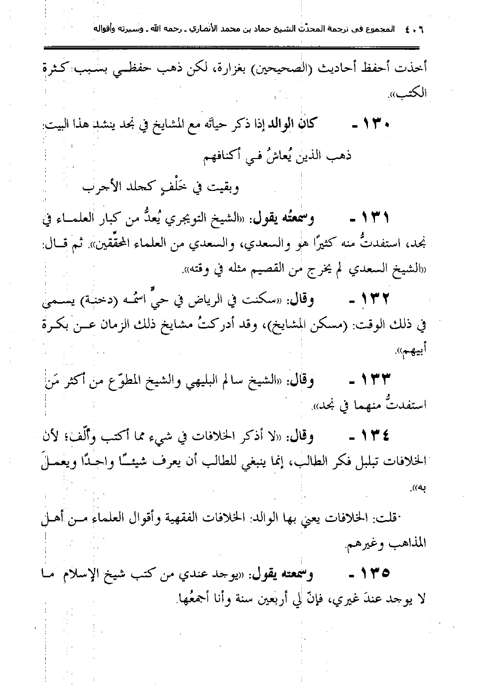 131- وسمعتُه يقول: "الشيخ التويجري يُعدُّ من كبار العلماء في نجد، استفدتُّ منه كثيرًا هو والسعدي، والسعدي من العلماء المحقِّقين". ثم قال: "الشيخ السعدي لم يخرج من القصيم مثله في وقته".