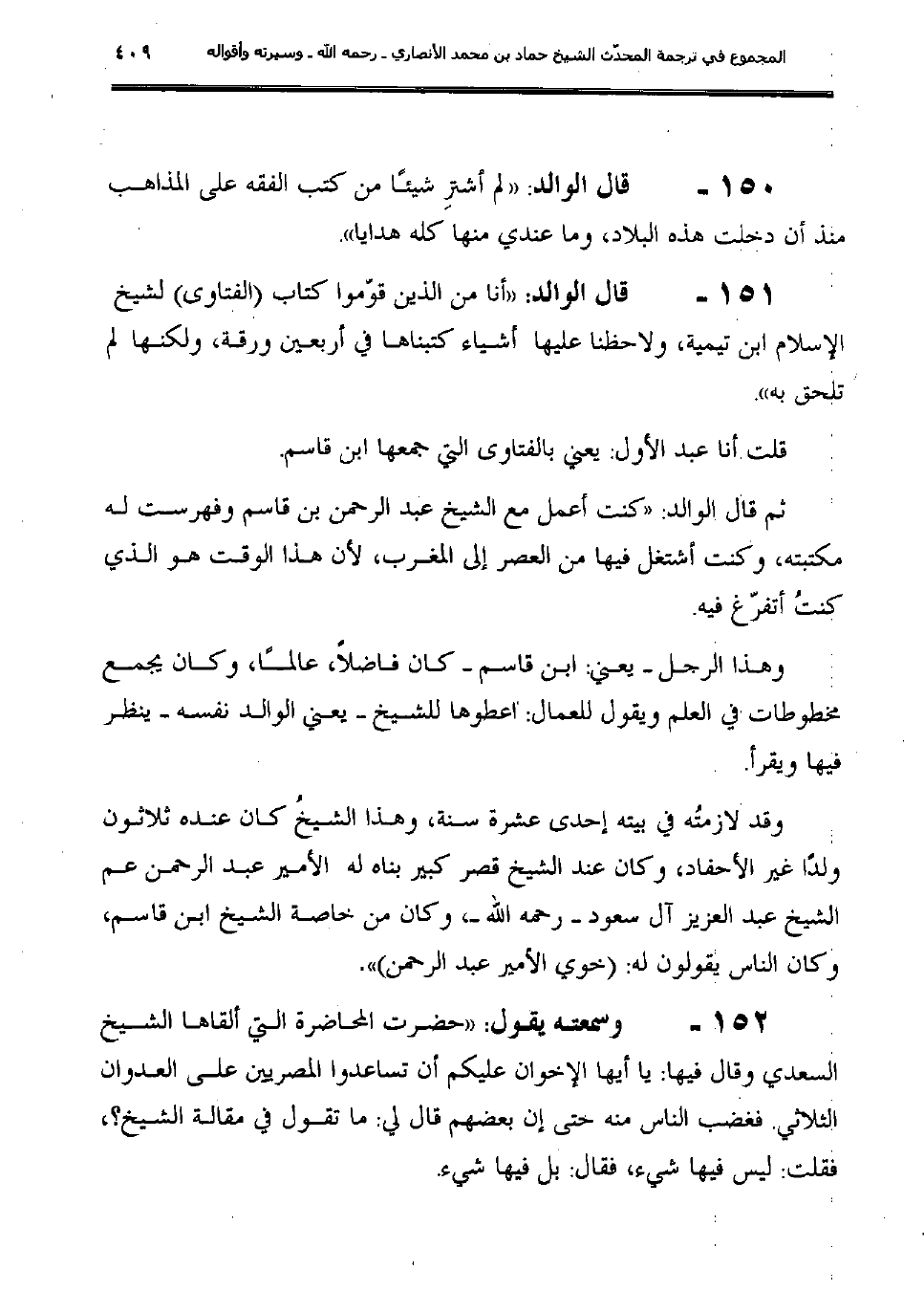 151- قال الوالد: "أنا من الذين قوّموا كتاب "الفتاوى" لشيخ الإسلام ابن تيمية، ولاحظنا عليها أشياء كتبناها في أربعين ورقة، ولكنها لم تلحق به".