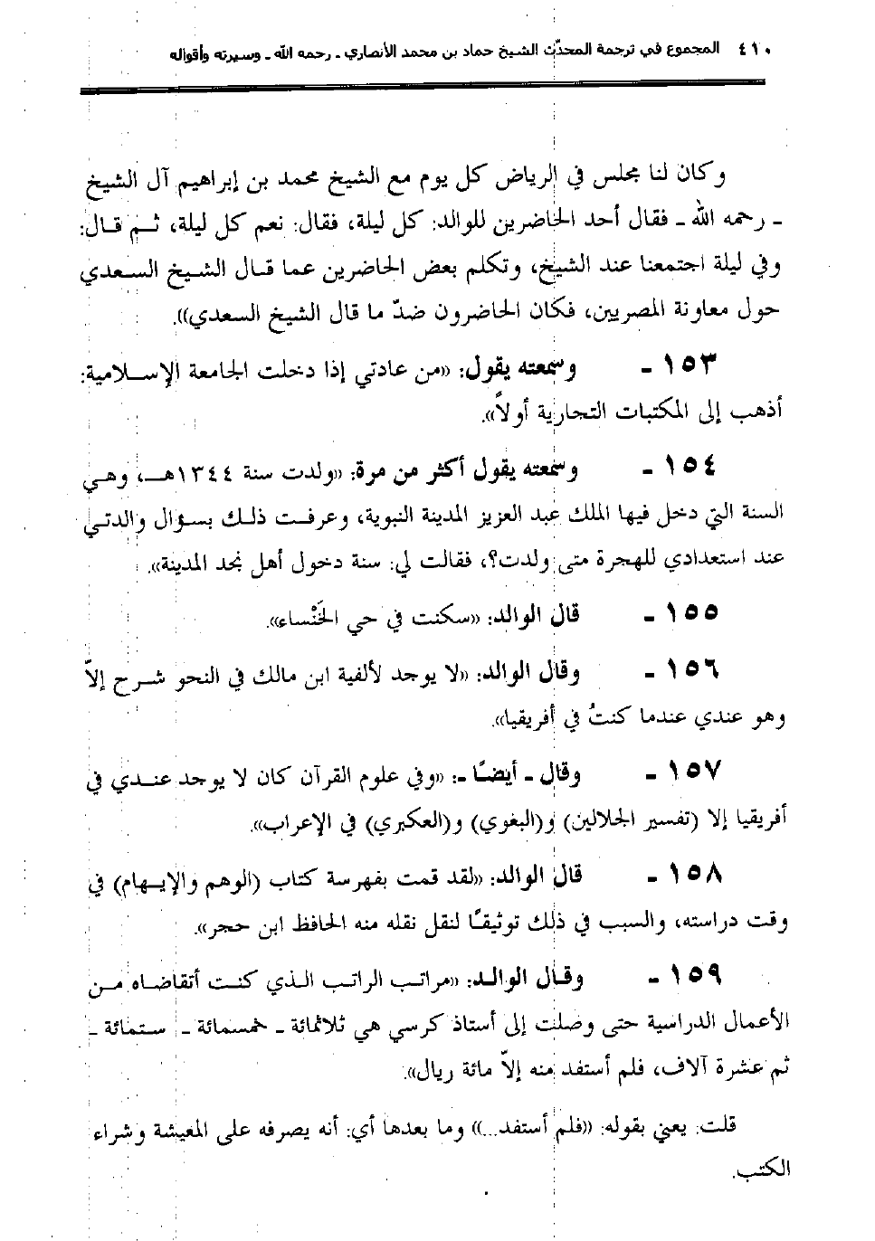 153- وسمعته يقول: "من عادتي إذا دخلت الجامعة الإسلامية: أذهب إلى المكتبات التجارية أولاً".