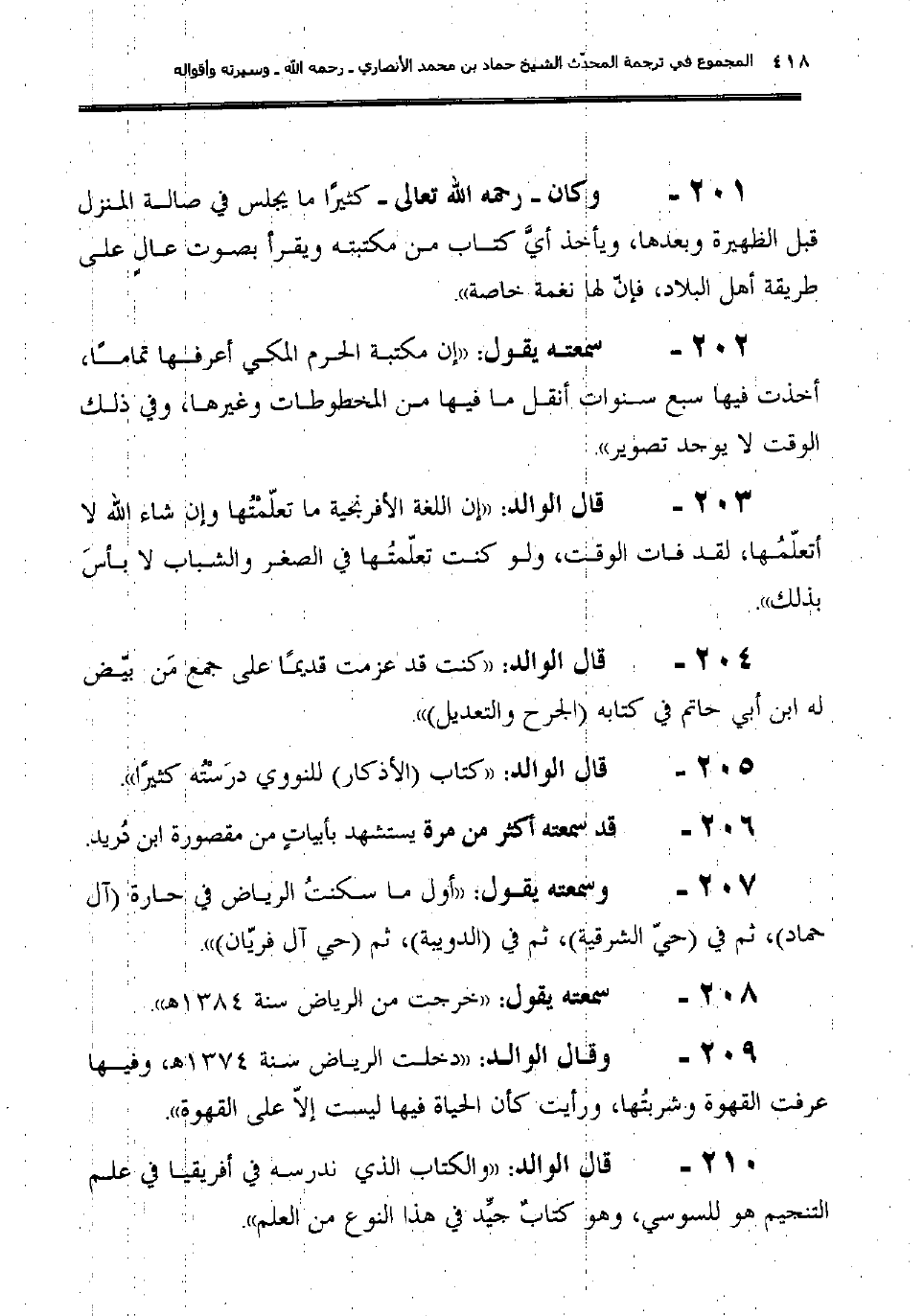 201- وكان رحمه الله تعالى كثيرًا ما يجلس في صالة المنزل قبل الظهيرة وبعدها، ويأخذ أيَّ كتاب من مكتبته ويقرأ بصوت عالٍ على طريقة أهل البلاد، فإنّ لها نغمة خاصة.