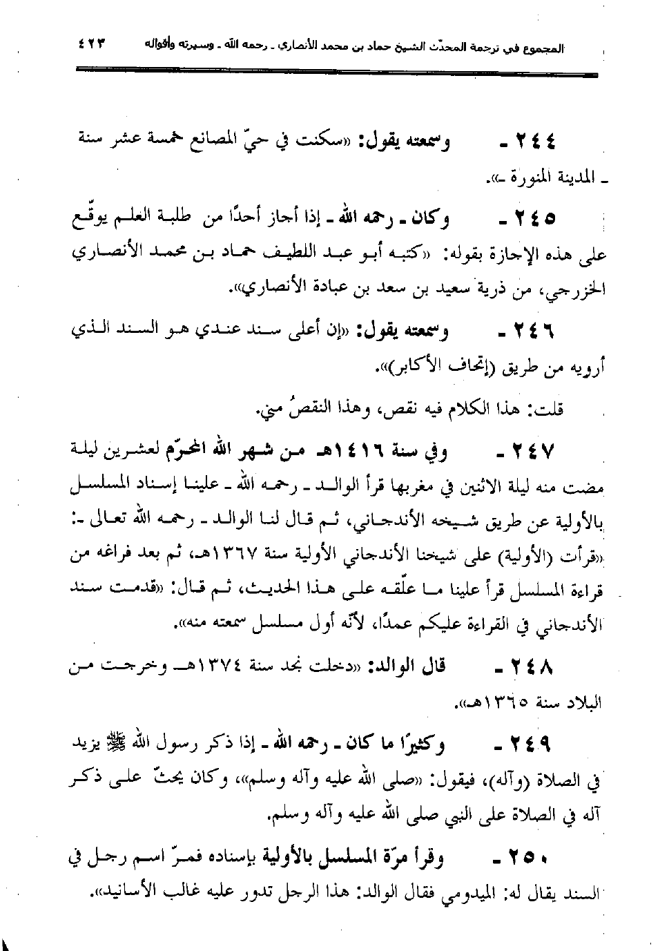 245- وكان رحمه الله إذا أجاز أحدًا من طلبة العلم يوقّع على هذه الإجازة بقوله: "كتبه أبو عبد اللطيف حماد بن محمد الأنصاري الخزرجي، من ذرية سعيد بن سعد بن عبادة الأنصاري".