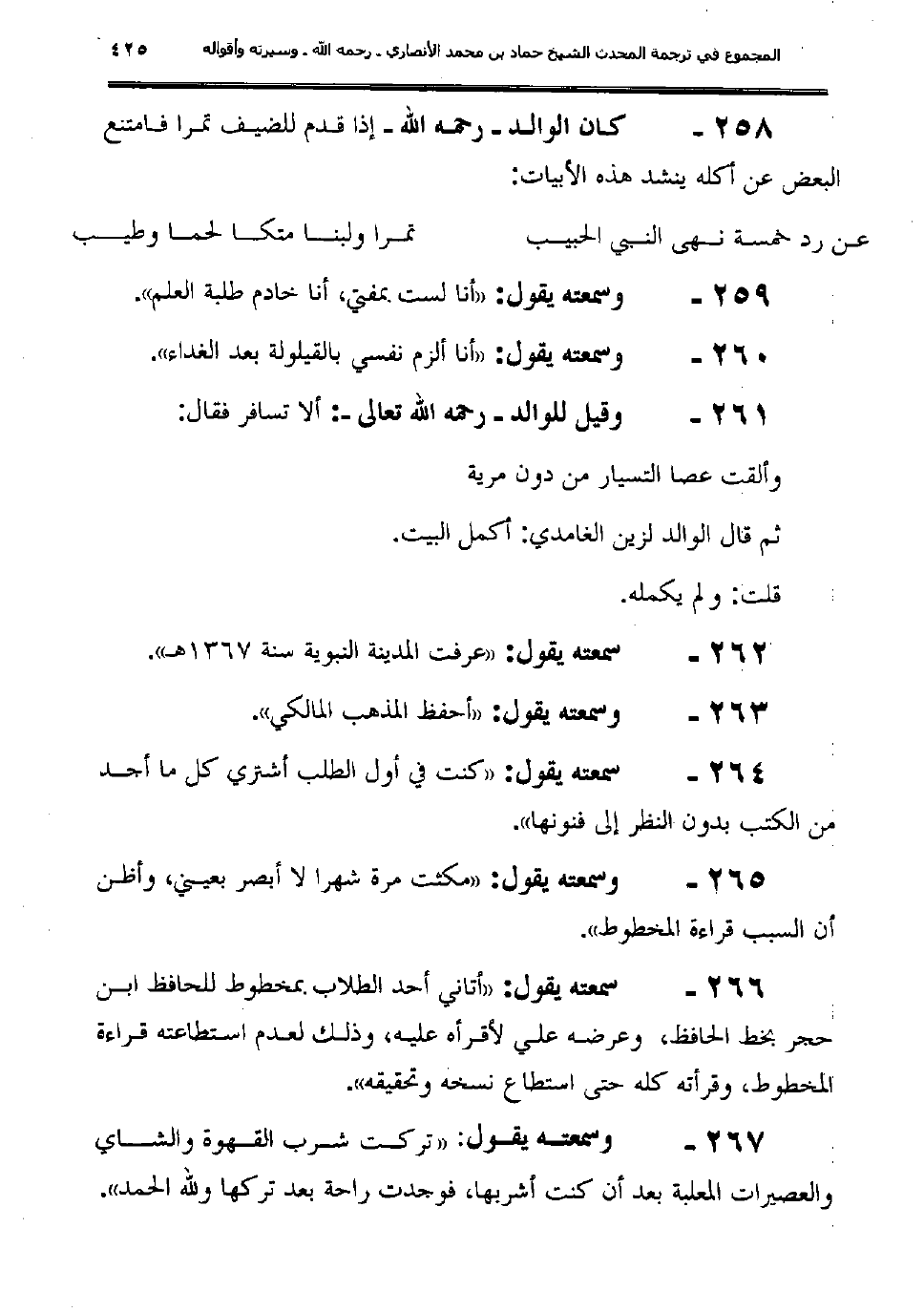 265- وسمعته يقول: "مكثت مرة شهرًا لا أبصر بعيني، وأظن أنّ السبب قراءة المخطوط".