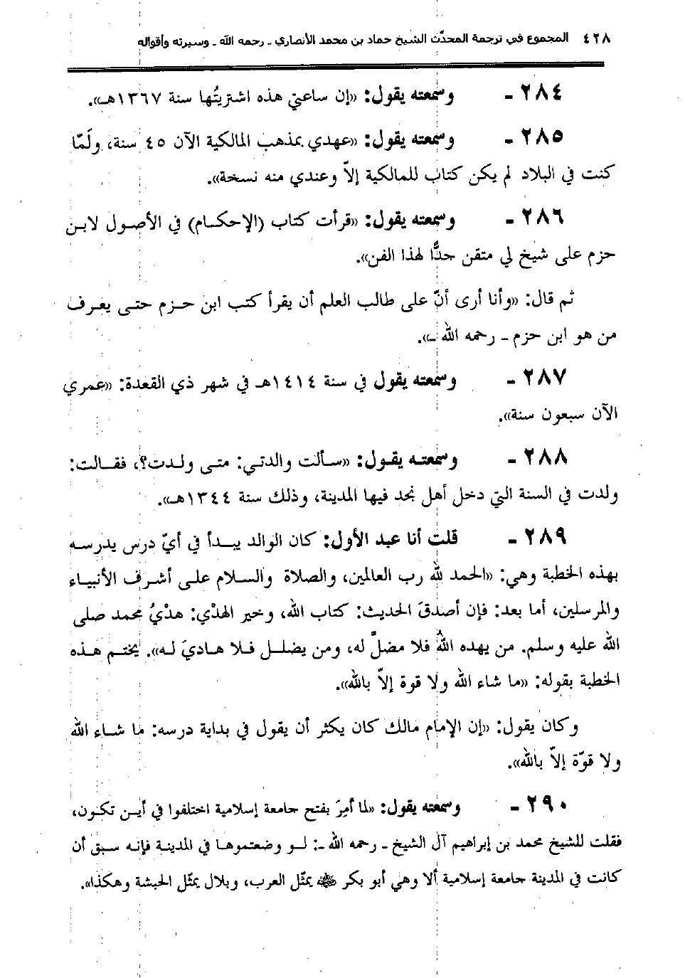288- وسمعته يقول: "سألت والدتي: متى ولدت؟، فقالت: ولدت في السنة التي دخل أهل نجد فيها المدينة، وذلك سنة 1344هـ".