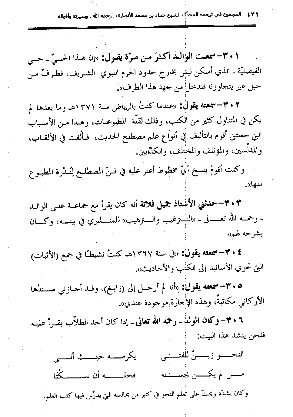 302- سمعته يقول: عندما كنتُ بالرياض سنة 1371هـ وما بعدها لم يكن في المتناول كثير من الكتب، وذلك لقلّة المطبوعات، وهذا من الأسباب التي جعلتني أقوم بالتأليف في أنواع علم مصطلح الحديث، فألّفت في الألقاب، والمدلِّسين، والمؤتلف والمختلف، والكذّابين.