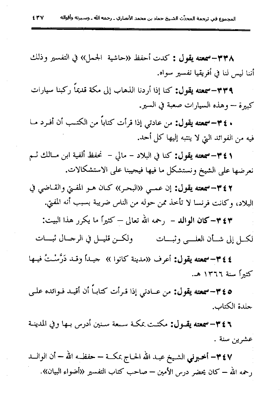 338- سمعته يقول: كدت أحفظ "حاشية الجمل" في التفسير وذلك أننا ليس لنا في أفريقيا تفسير سواه.